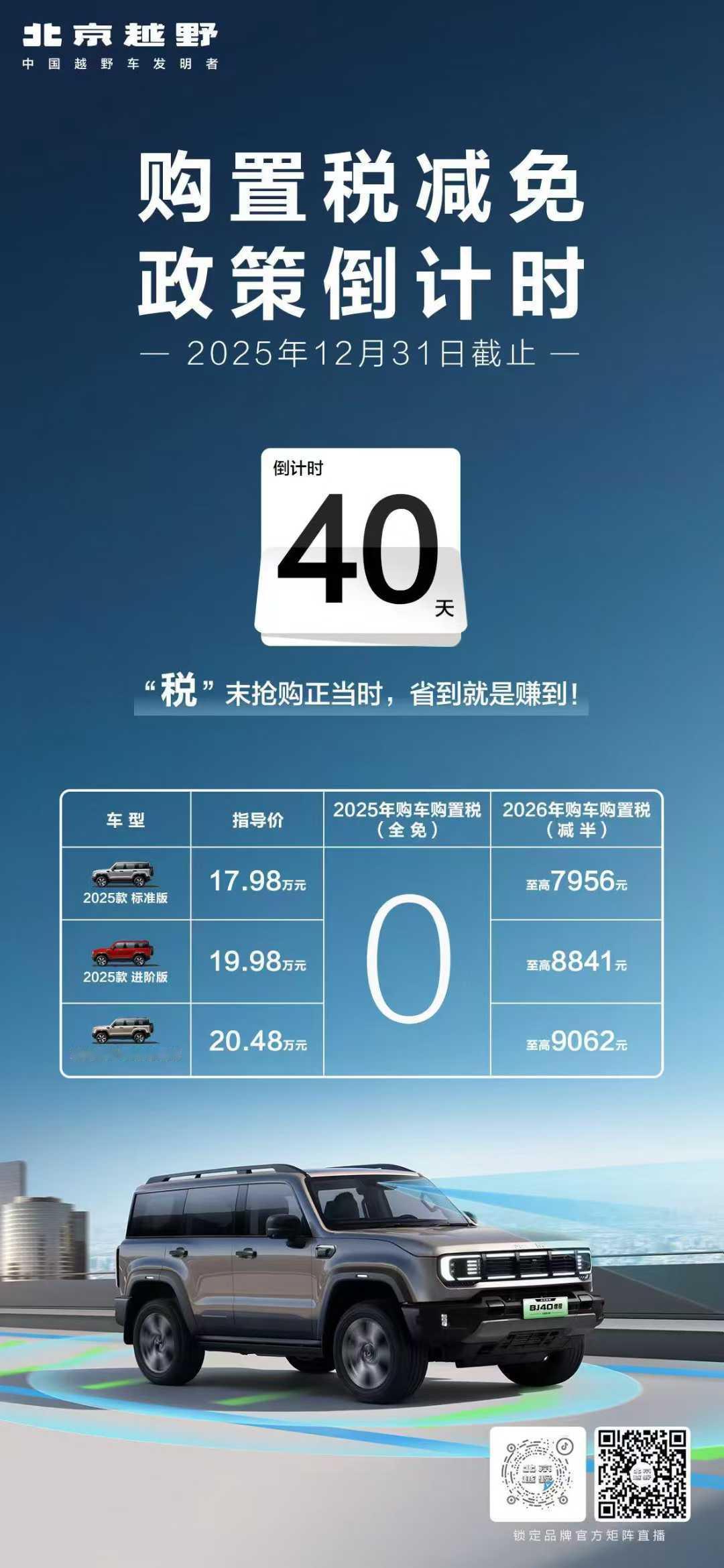 北京越野购置税全免倒计时40天 叠加至高18000元厂家补贴 省到即是赚到