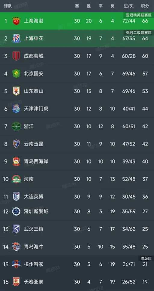 中超收官最新积分榜一览表:海港3连冠 梅州亚泰降级 北京时间11月22日,2025赛季中超第30轮全部战罢,积分榜尘埃落定。上海海港1-0绝杀大连英博,以66分实现中超三连冠;上海申花3-1胜天津津门虎,积64分获亚军。成都蓉城、北京国安分列三四名。梅州客家与长春亚泰携手降级,北京国安外援法比奥以28球斩获金靴。