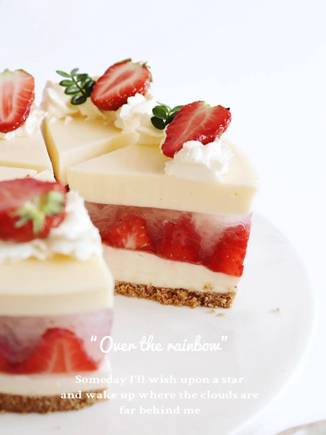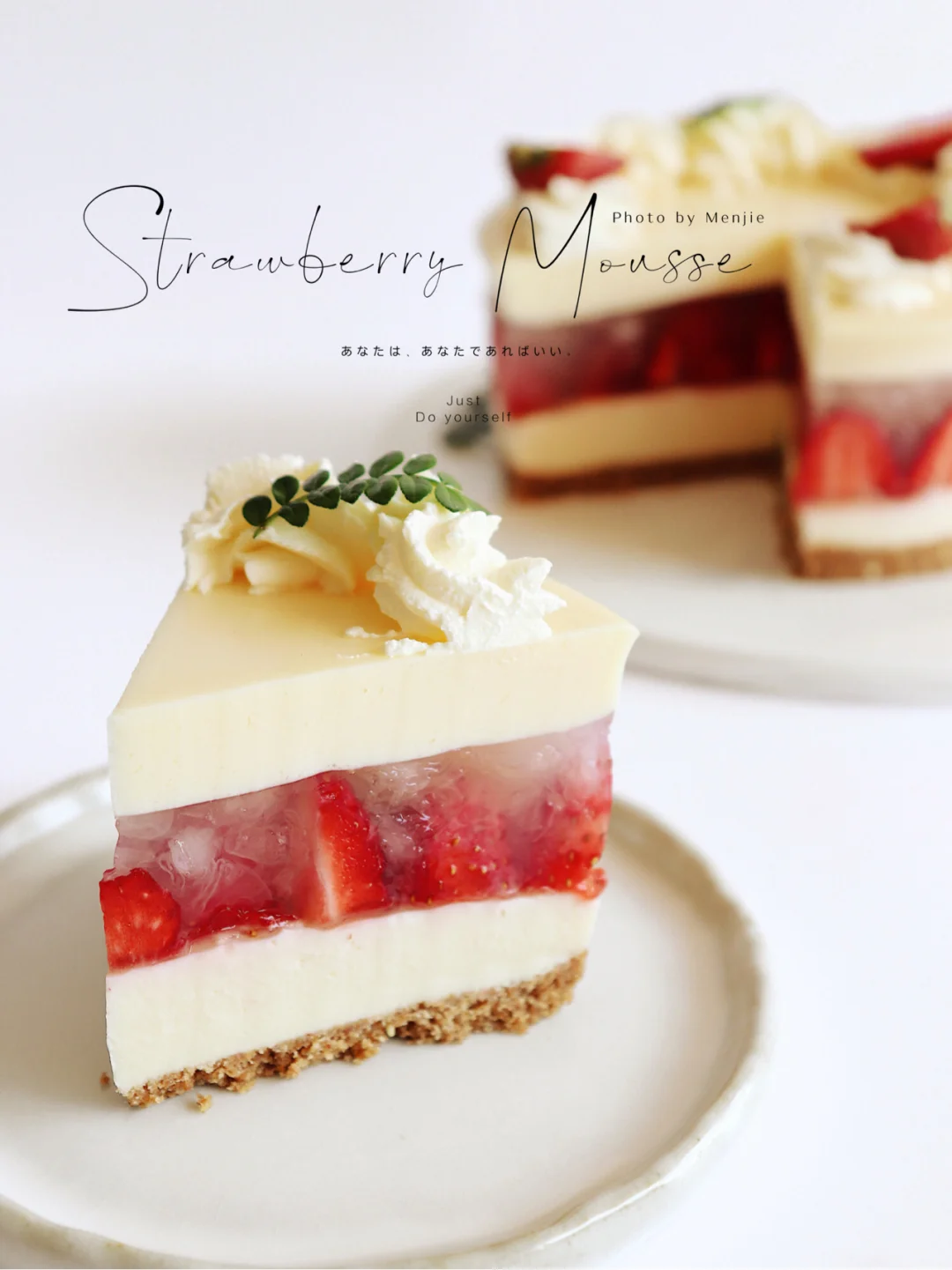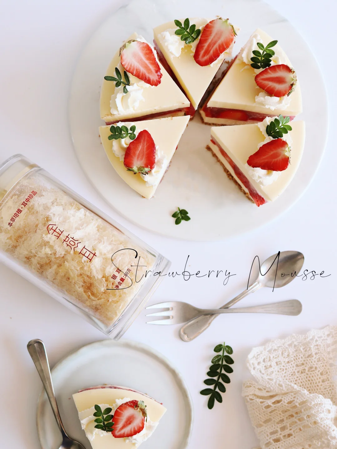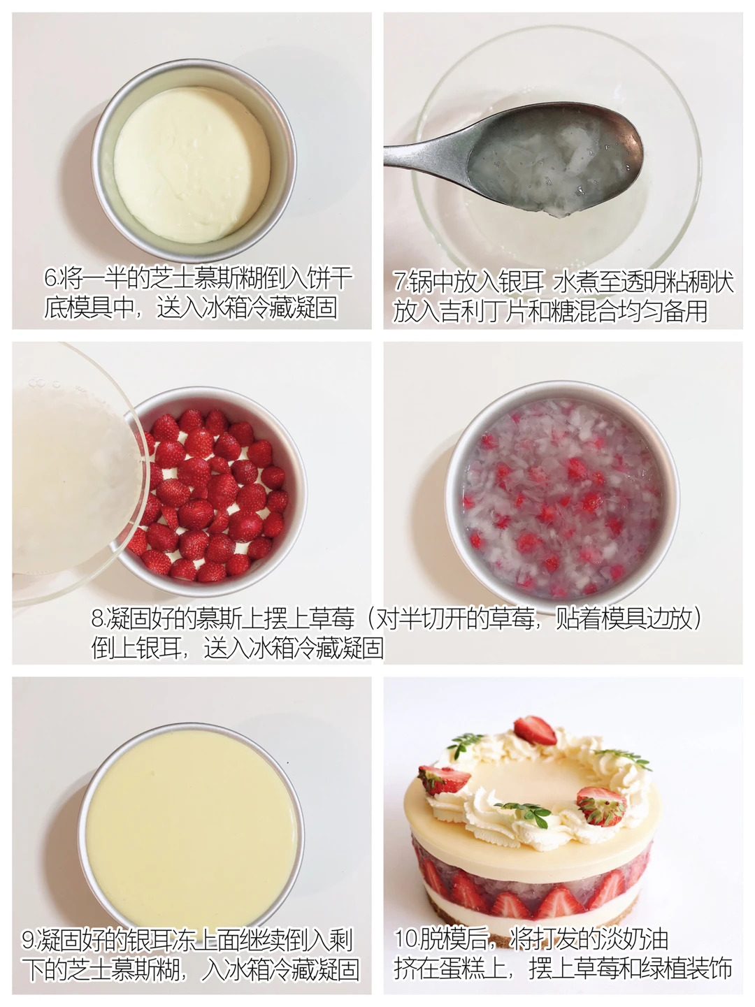 ❼在凝固好的慕斯上摆上草莓(对半切开的草莓,贴着模具边放),倒上银耳入冰箱冷藏凝固。凝固好以后,再将剩下的芝士慕斯糊倒在银耳冻上面,入冰箱冷藏凝固。
