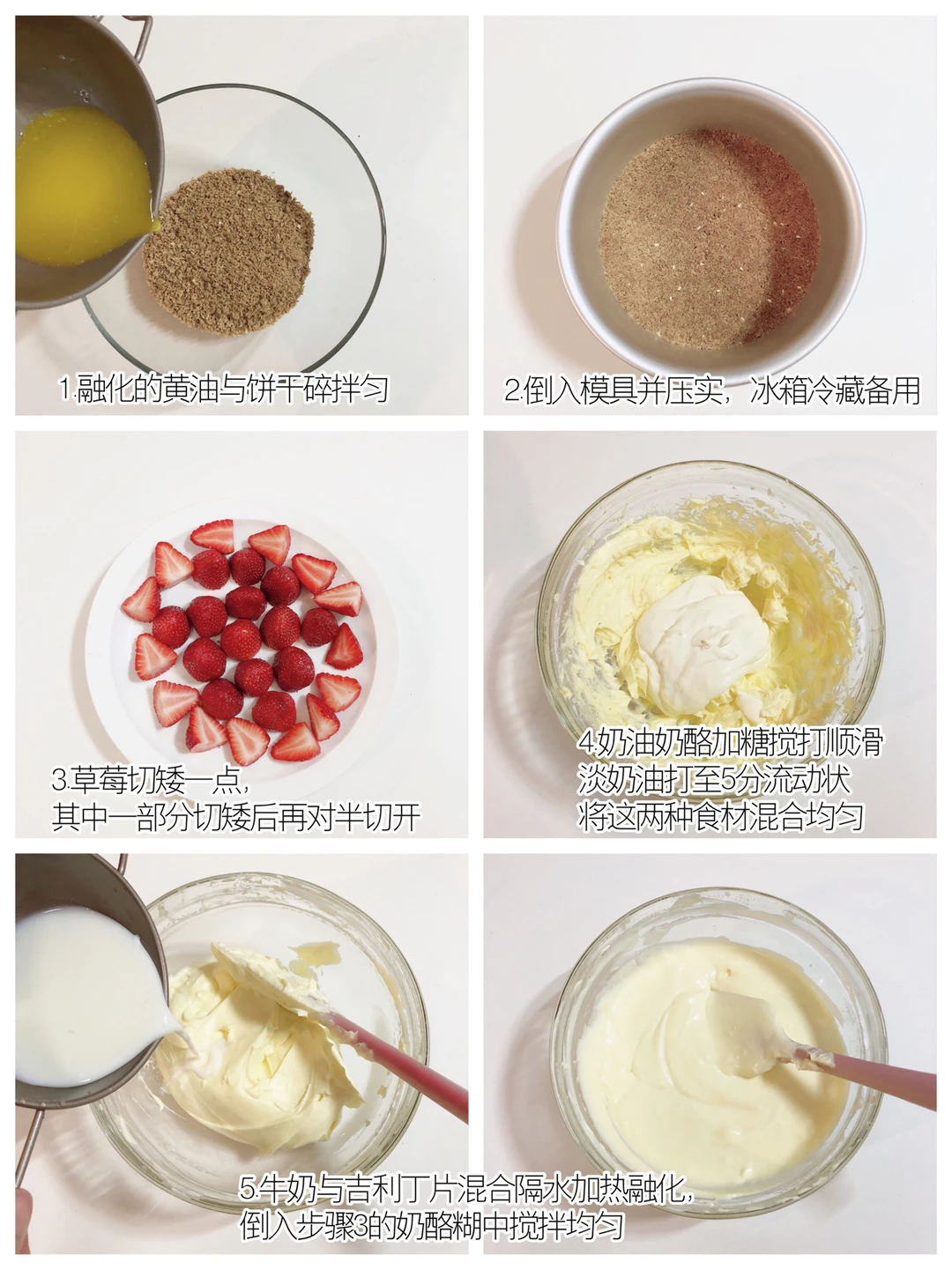 ❶消化饼干敲碎,与融化的黄油混合拌匀,铺入模具中并压实,入冰箱冷藏备用。