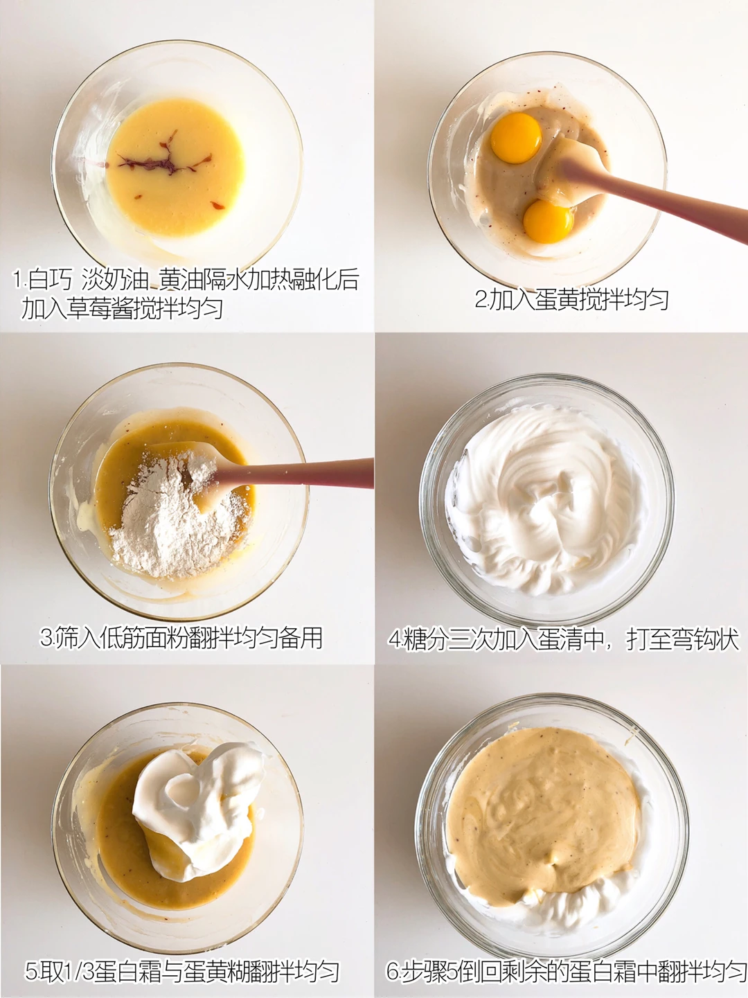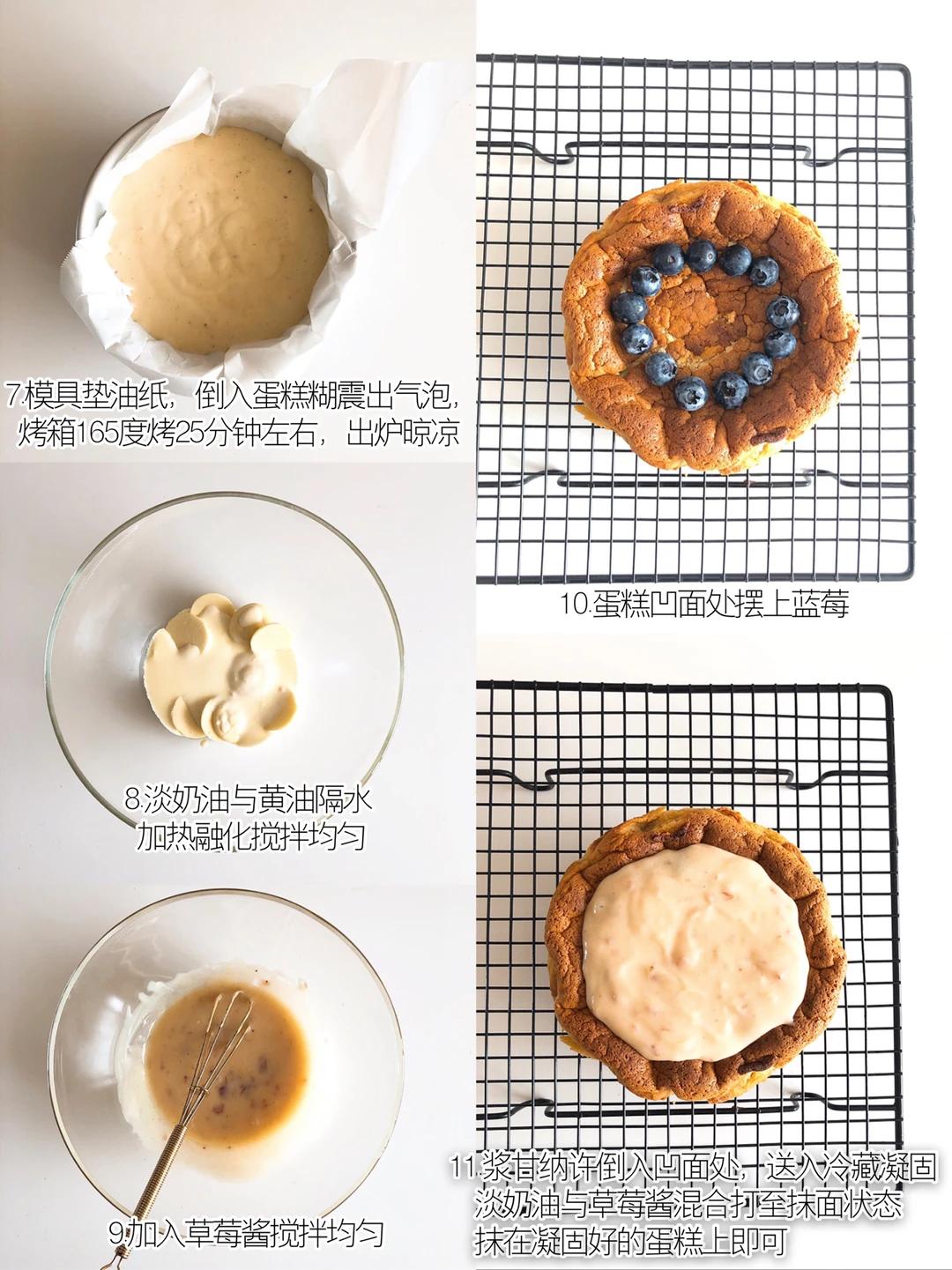 我这是有多爱凝酪蛋糕😂 又又又做了草莓🍓味的 蛋糕上还夹了蓝莓🫐 吃起来酸甜不腻[色色R]真的太🉑️了 你们一定要试试哦[萌萌哒R] - ❏  蛋糕体食材(6寸) 白巧克力—70g 淡奶油−40g 黄油—40g 鸡蛋—2个 细砂糖—20g 低筋面粉—25g 草莓酱—40g ❏  中层甘纳许食材 白巧克力—35g 淡奶油—30g 草莓酱—20g 吉利丁片—2g(提前冷水泡软) ❏  抹面食材 淡奶油−160g 草莓酱—15g - ❏  制作步骤 ❶白巧克力、黄油、淡奶油混合隔水加热融化搅拌均匀,加入草莓酱混合均匀,再加入蛋黄搅拌均匀,筛入低筋面粉翻拌均匀备用。 ❷细砂糖分3次加入到蛋清中,打至弯钩状。 ❸取1/3的蛋白霜加到蛋黄糊中翻拌均匀后,再倒回剩余的蛋白霜中继续翻拌均匀。 ❹模具垫油纸,倒入蛋糕糊并震出气泡。烤箱预热165度,烤25分钟左右。出炉震出热气,晾凉(不要倒扣)凹面会自然形成。(如果凹陷处不够深,可以用勺子🥄挖深一点)。 ❺在晾凉好的蛋糕凹陷处摆上蓝莓🫐备用。 ❻做中层甘纳许:白巧克力与淡奶油混合隔水加热融化搅拌均匀,加入草莓酱和泡软的吉利丁片,搅拌均匀,倒入蛋糕的凹面处,送入冰箱冷藏凝固。 ❼做抹面:淡奶油打到浓稠状,加入果酱,打至抹面状态,抹在凝固好的蛋糕上即可。(我的草莓酱比较甜,所以这一步我没有加糖) - 📔Tips: ✏️一定要根据自家烤箱脾气调整时间和温度❗️ ✏️蛋糕出炉时,蛋糕的内部要有一点流心状态,所以才会形成凹面,自己观察一下哦。即使烤过了也没关系哈,可以趁热用手按下去,或者等凉了以后,用勺子🥄将蛋糕中间挖空[斜眼R]