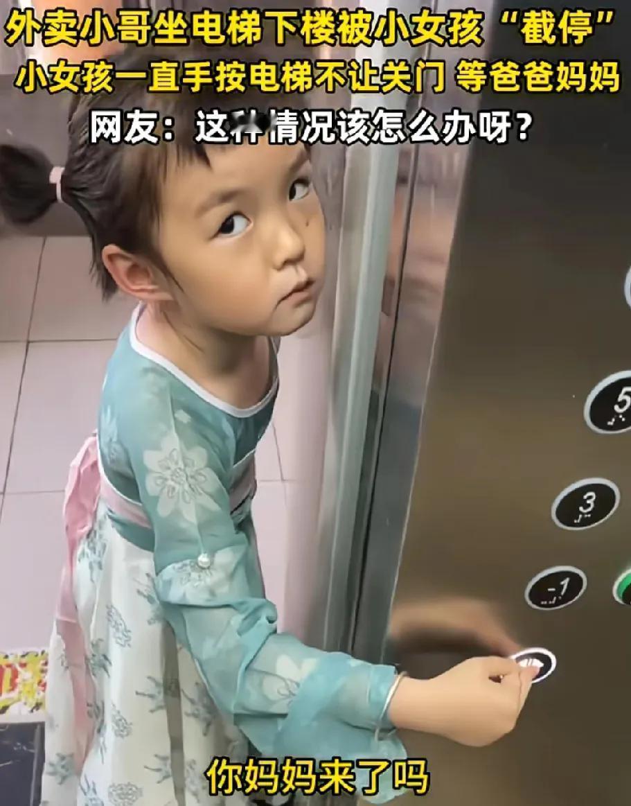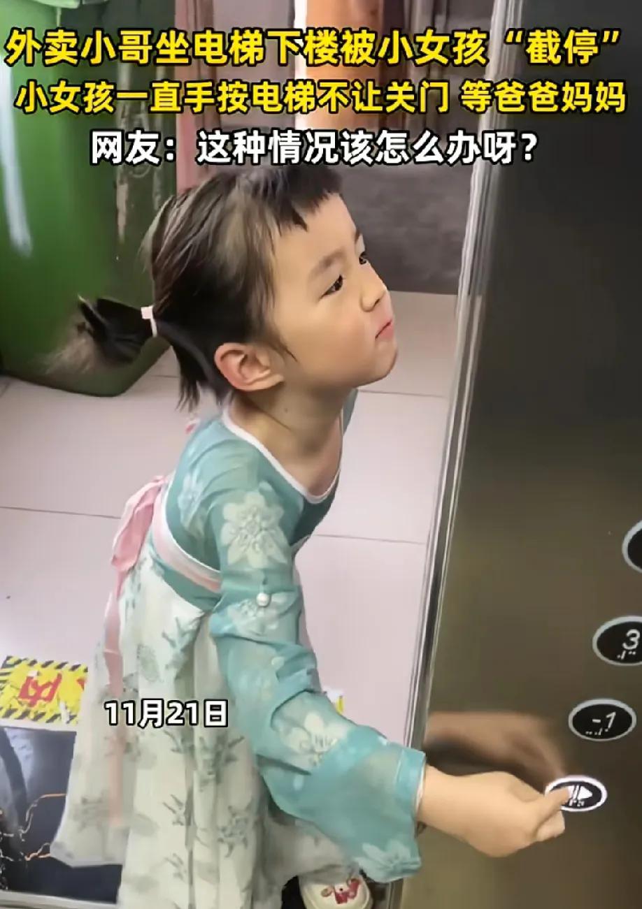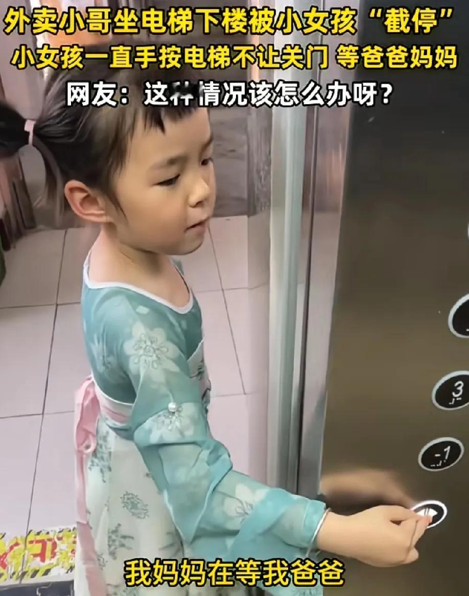 一外卖小哥坐电梯下楼被小女孩“截停”,小女孩一直手按电梯不让关门等爸妈。等爸妈没