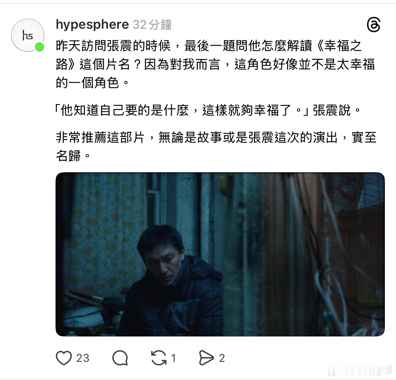 「他知道自己要的是什麼,這樣就夠幸福了。」張震說。