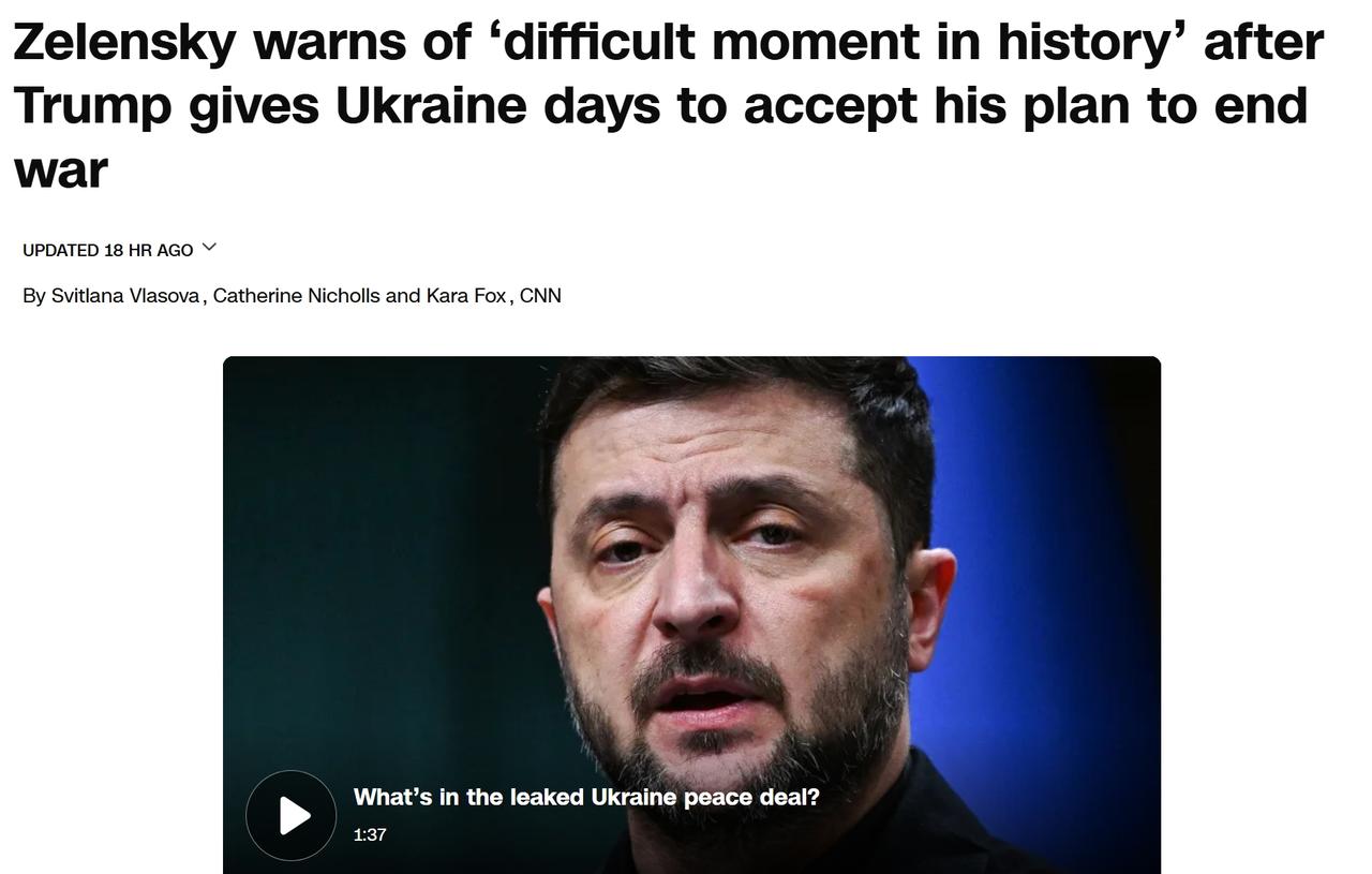特朗普对乌克兰下最后通牒,泽伦斯基称乌克兰面临“历史上最艰难的时刻” 美国总统特朗普提出了一项关于结束俄乌战争的“28条”计划,并要求乌克兰在一周之内接受,泽连斯基则表示,乌克兰正面临“历史上最艰难的时刻之一”。 特朗普提出的28点计划被广泛认为偏袒俄罗斯,要求乌克兰割让领土、限制军队规模,并承诺不加入北约以换取战争结束,这些都是普京长期以来的诉求。 特朗普周五在椭圆形办公室表示,他相信该计划是“实现和平的方式”,但仍需泽连斯基批准。然而,他暗示泽连斯基别无选择,只能接受。 泽连斯基在周五向全国发表视频讲话时将其形容为向乌克兰呈现出失去尊严或关键盟友之间的选择。泽连斯基在视频讲话中表示:“乌克兰面临的压力目前达到最强烈。乌克兰现在可能面临一个非常艰难的选择:要么失去尊严,要么失去关键伙伴,或者面临28个难点,或者一个极其严酷的冬天。” 泽连斯基表示,乌克兰将“冷静迅速”与美国及其伙伴合作,推动战争结束。泽连斯基周五与美国副总统JD·范斯就该计划进行了交谈。 此前,俄罗斯总统弗拉基米尔·普京在安理会简报会上表示,他已收到美国的提议,并认为该提案“可能成为最终和平解决方案的基础”。 自特朗普提议细节公布以来,多位欧洲领导人公开支持乌克兰,誓言支持基辅,并坚持在没有基辅参与的情况下不应对国家命运做出任何决定,但是没有得到特朗普的任何回应。