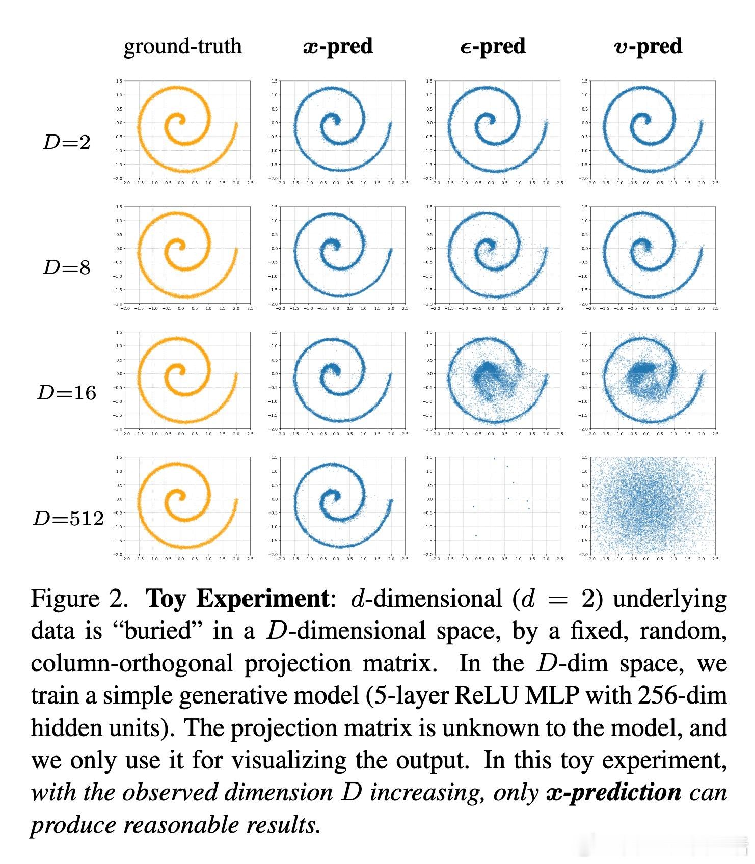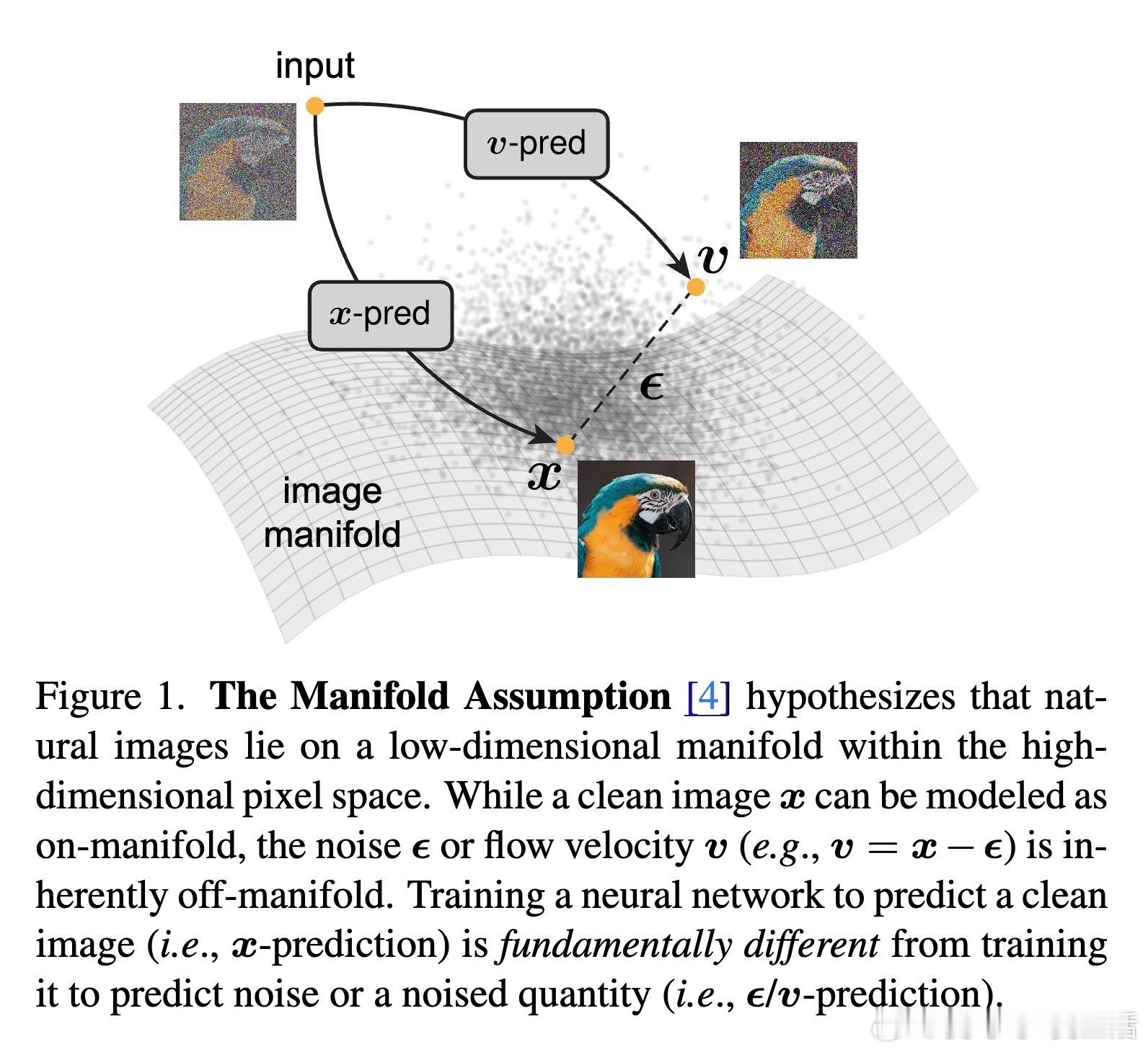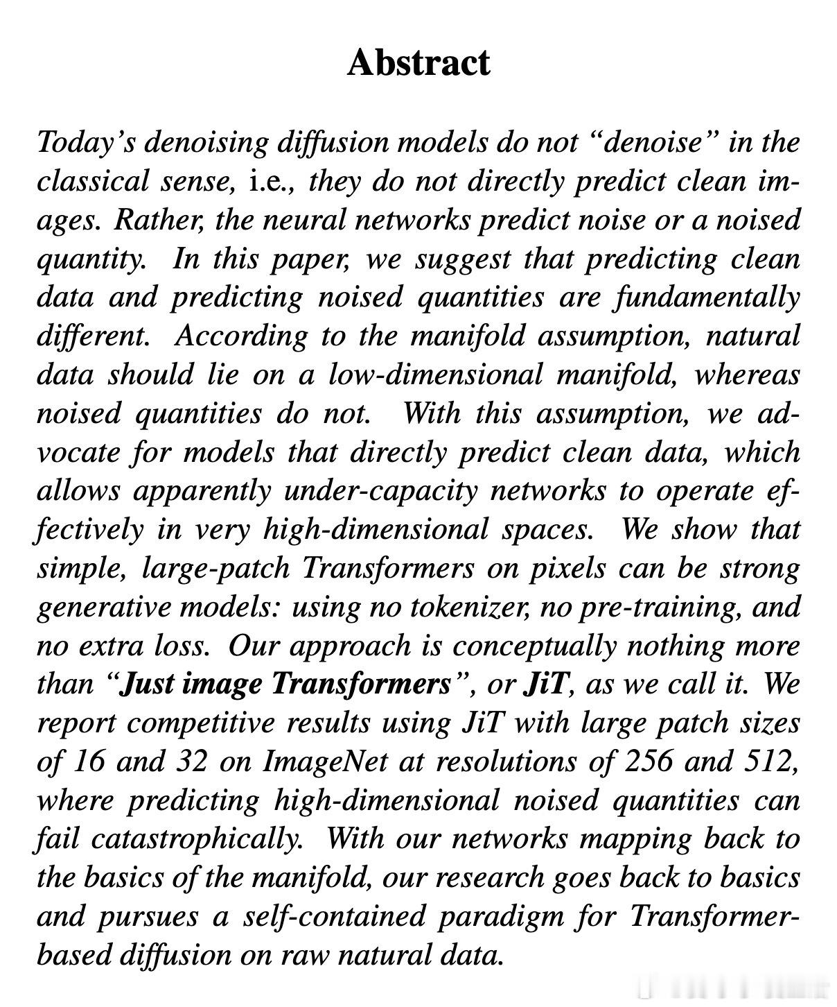 [CV]《Back to Basics: Let Denoising Generative Models Denoise》T Li, K He [MIT] (2025) 回归本质:让去噪生成模型真正去噪近年来,扩散模型广泛流行,但主流方法不再直接预测干净图像,而是预测噪声或带噪信号。本文提出,预测干净数据与预测噪声本质不同。基于“数据位于低维流形”假设,直接预测干净图像更符合自然数据结构,有助于网络在高维空间中高效工作。他们设计了“Just image Transformers”(简称JiT),即直接在像素大块上用纯粹的Vision Transformer(无预训练、无额外损失)进行扩散模型训练。实验证明,JiT在ImageNet 256×256、512×512分辨率下表现优异,预测噪声的传统方法在高维像素空间会出现灾难性失败。关键发现包括:- 预测干净图像(x-prediction)是高维扩散建模的关键,噪声预测(ε-prediction)和速度预测(v-prediction)在高维空间表现不佳。- 通过引入瓶颈层降低维度,不仅不会损失性能,反而能提升生成质量,呼应经典流形学习中的低维表示思想。- 采用logit-normal噪声采样策略,调节噪声水平可以优化训练,但不能解决噪声预测本身的能力不足问题。- 纯Vision Transformer架构,无需特殊预训练或复杂模块,模型容量与输入维度解耦,展现出良好可扩展性。这项工作强调神经网络能力有限,应聚焦于更易学习的“干净数据”空间,有助扩散模型摆脱对预训练潜变量空间的依赖,实现真正自洽的“Diffusion+Transformer”范式。此简洁有效的设计对科学领域处理高维自然数据(如蛋白质结构、分子、气象数据)具有重要启示,减少领域特定设计的需求,推动通用生成模型发展。论文:arxiv.org/abs/2511.13720这篇论文提醒我们:在高维复杂数据的生成任务中,回归本质、尊重数据结构,往往能带来意想不到的突破。让去噪模型回归“去噪”本身,也许是开启更强大生成能力的钥匙。