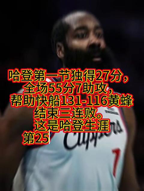 哈登第一节独得27分,全场55分7助攻,帮助快船131-116黄蜂结束三连败。这是哈登生涯第25次得分50+,与科比并列历史第三。第一是张伯伦118次,第二是乔丹31次!