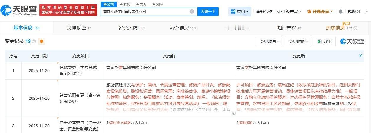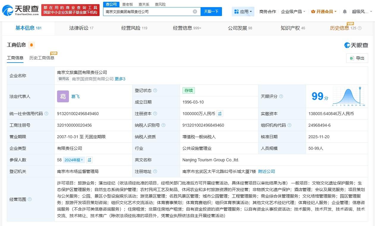南京旅游集团公司更名为文旅集团增资至100亿 天眼查App显示,近日,南京旅游集团有限责任公司发生工商变更,企业名称变更为南京文旅集团有限责任公司,注册资本由约13.8亿人民币增至100亿人民币,同时经营范围也发生变更。 该公司成立于1996年3月,法定代表人为葛飞,由南京市城市建设投资控股(集团)有限责任公司、南京市国有资产投资管理控股(集团)有限责任公司、南京市人民政府国有资产监督管理委员会共同持股。 天眼查信息: