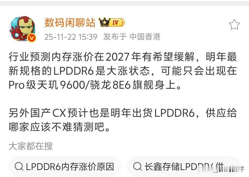 内存涨价涨到27年[泪奔]那不用首发换机了,大内存版本新机价格可能会新高,等降价了再考虑要不要换新机,或者等到28年换[思考]还有LPDDR6是明年Pro旗舰的顶配版本估计才有,就是因为价格高,普及不了,之前存储便宜的时候24+1TB价都不高[捂脸]