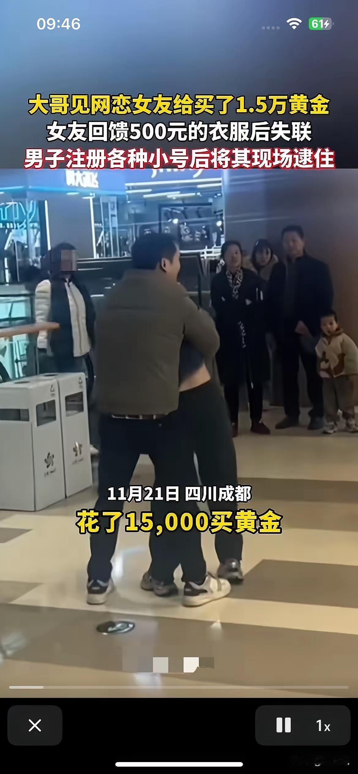 成都的一位大哥因为网恋,给“女友”买了1.5万元的黄金。对方只回了一件500元的衣服,之后就彻底失联了。 大哥气不过,注册了好几个小号,通过网络聊天把对方约了出来。在商场里,他直接把人逮了个正着,现场闹得不小。 兄弟水平高啊,这种办法确实值得借鉴哈,给那些被捞的男生提供了一个新思路。[笑哭]