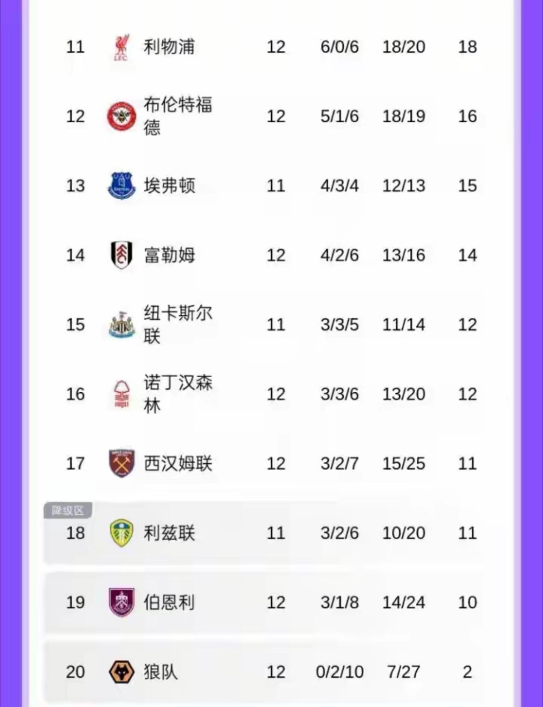 英超第12轮,利物浦主场0-3不敌森林,排名跌至第11名。利物浦本赛季英超已输掉6场,他们上赛季整赛季才输4场。此外,利物浦打进18球却丢了20球,净胜球已是-2。