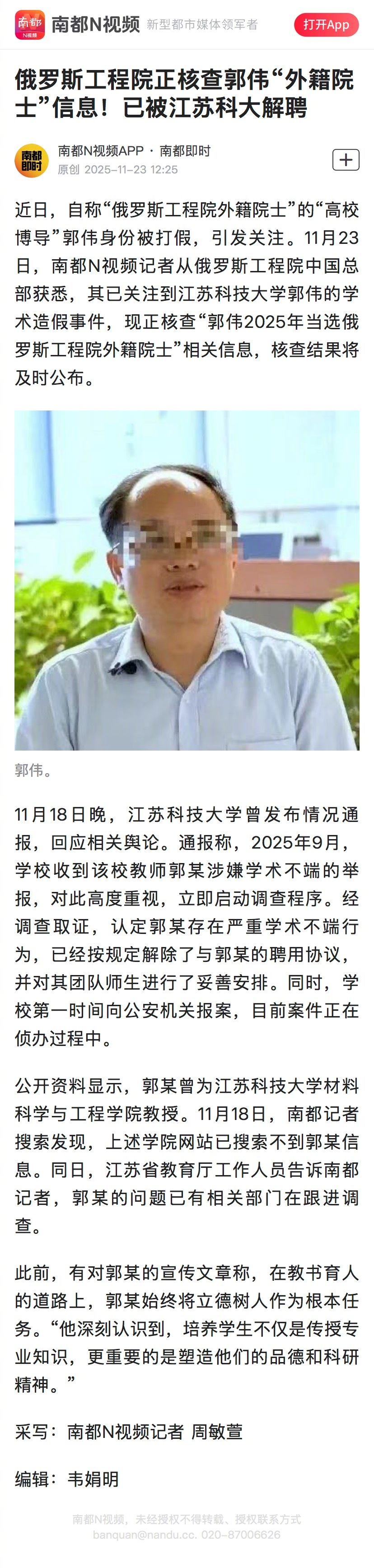 【俄罗斯工程院正核查郭伟“外籍院士”信息!已被江苏科大解聘】近日,自称“俄罗斯工程院外籍院士”的“高校博导”郭伟身份被打假,引发关注。11月23日,南都N视频记者从俄罗斯工程院中国总部获悉,其已关注到江苏科技大学郭伟的学术造假事件,现正核查“郭伟2025年当选俄罗斯工程院外籍院士”相关信息,核查结果将及时公布。11月18日晚,江苏科技大学曾发布情况通报,回应相关舆论。通报称,2025年9月,学校收到该校教师郭某涉嫌学术不端的举报,对此高度重视,立即启动调查程序。经调查取证,认定郭某存在严重学术不端行为,已经按规定解除了与郭某的聘用协议,并对其团队师生进行了妥善安排。同时,学校第一时间向公安机关报案,目前案件正在侦办过程中。南都N视频记者 周敏萱