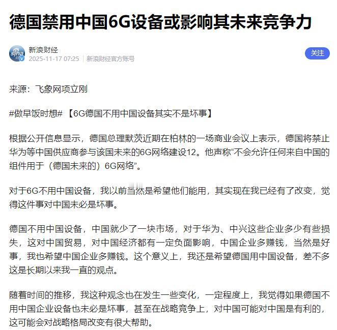 中德彻底决裂了? 据媒体11月17日报道:德国总理默茨近日公开表示,绝不会允许由中方生产的组件进入德国未来的6G网络建设中来。 默茨近日宣布的这一决策,背后的复杂逻辑远超技术范畴,暴露出欧洲在数字主权博弈中的深层困境。 欧盟2025年流传在欧盟内部的《数字网络法案》(DNA)虽为成员国设定了5G/6G设备替换的法律框架,但成员国执行层面的分歧已显现。 德国高调推进“去中国化”,西班牙、希腊等国却选择与华为续签合同,通过“核心网替换、边缘网保留”的折中方案规避压力。 这种撕裂源于法案对“高风险供应商”缺乏明确技术判定标准,给各国留下巨大解读空间。 更讽刺的是,德国自身5G替换进度严重滞后,2025年上半年仅完成核心网30%替换,成本却超预期近一倍,凸显政策与现实的脱节。 欧洲6G研发虽在实验室取得进展,却存在量产能力不足的硬伤。欧盟“智能网络与服务联合计划”2025年投入1.28亿欧元研发资金,仅为华为单季度研发预算的1/4,且在半导体制造、AI算力等上游环节存在致命短板。 全球6G专利池中,中国占比40.3%,欧洲仅8%且多集中于非核心领域,即便德国强行替换硬件,未来仍需向中国企业支付专利费,“硬件脱钩、专利依赖”的悖论让“数字主权”沦为空谈。 经济层面的代价更触目惊心,巴克莱银行测算全面替换5G设备直接成本达25亿欧元,隐性支出叠加后总成本或突破50亿欧元。 政府20亿欧元补贴杯水车薪,最终成本要么通过每户月费增加6.7欧元转嫁民众,要么削减乡村基站建设。 德国铁路替换900个基站需停工半年,货运效率下降30%,而依赖通信设备的汽车制造业更受冲击,大众、宝马等车企在华自动驾驶测试因兼容性问题暂缓,智能化升级成本激增40%,持续透支德国制造业竞争力。 这一决策本质是对美国技术霸权的妥协,北约施压下德国被迫选边站队,却陷入中美技术挤压的尴尬。 中国在太赫兹通信等领域的专利布局形成技术壁垒,美国通过“印太6G联盟”构建排他圈,欧洲既无法融入中美生态,又无力自建标准。 更危险的是,2025年前8个月中国已重回德国最大贸易伙伴,技术脱钩可能引发中方在汽车、化工领域的反制,形成“杀敌一千自损八百”的循环。 替代方案的荒诞更凸显决策盲目,诺基亚、爱立信仅能满足欧洲60%设备需求,剩余缺口需高价采购韩国三星设备(比华为贵25%),且爱立信支持开放式网络的设备仅占交付量三分之二,可能导致网络性能下降15%-20%。 德国将6GHz高频段划归移动运营商,忽视其更适配Wi-Fi 7的特性,加剧频谱资源错配。 德国的6G“去中国化”本质是政治凌驾于市场规律的选择,短期面临经济阵痛,长期可能丧失数字竞争主动权。 真正的数字主权,应建立在技术创新与开放合作的平衡上,而非制造技术割裂。 当德国为政治正确支付高昂学费时,或许该重新审视:所谓“主权”,究竟是保护国家利益的盾牌,还是束缚发展的枷锁?