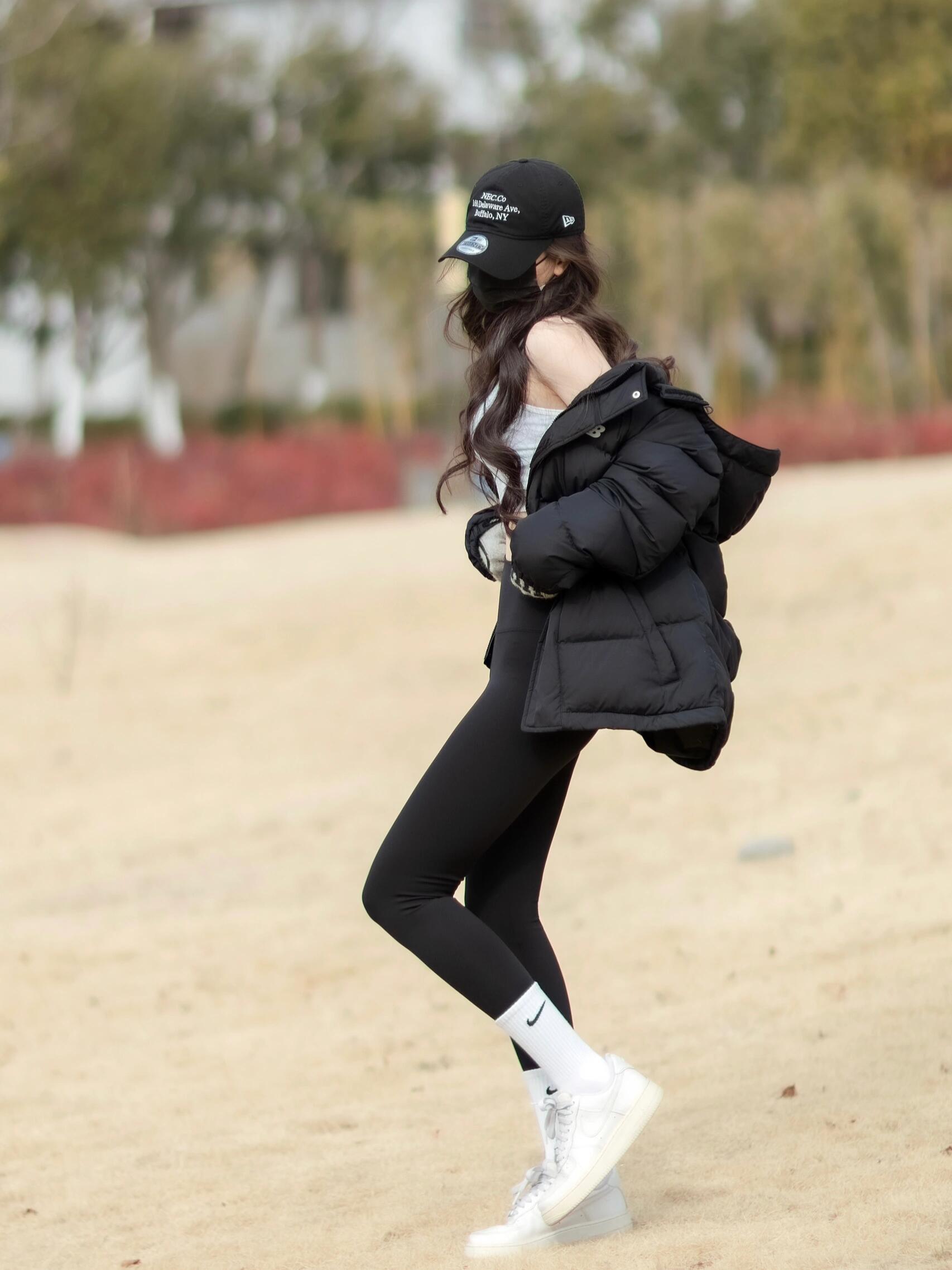 瑜伽裤穿搭 冬日沙滩上,海风拂面,一位美女身着瑜伽裤搭配羽绒服,轻松漫步。这不再是健身房的专属穿搭,而是如今时尚圈的新潮流——将功能性与时尚感完美结合的户外造型。