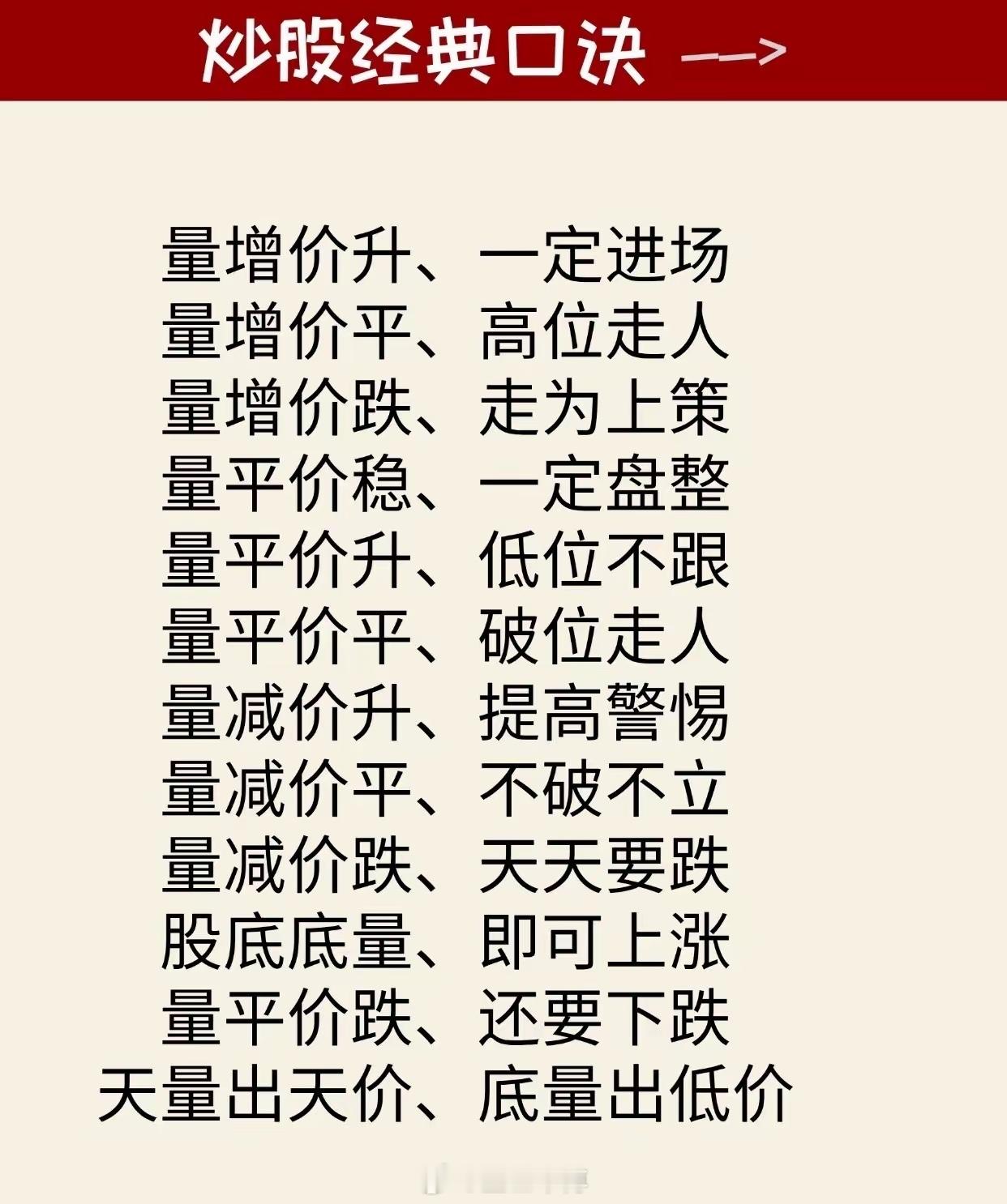 炒股相关的经典口诀汇总,内容聚焦于通过简明扼要的口诀形式,帮助股民掌握量价关系、买卖时机、趋势判断及风险应对等核心投资技巧。具体口诀内容可分为以下几类:1. 量价关系与操作建议(如第2张图):涵盖“量增价升、一定进场”“量增价平、高位走人”“量增价跌、走为上策”等13条,总结成交量与价格同步或背离时的典型操作方向(如放量上涨可入场、放量下跌需离场等)。2. 日内交易时段策略(如第3张图):针对早/下午盘不同走势给出具体建议,例如“早上大跌要加仓,早上大涨要减仓”“下午大涨只减仓,下午大跌次日买”“上午拉高不追涨,逢高减仓T+1”等,强调利用时段波动优化操作节奏。3. 关键均线参考规则(如第4张图):围绕季线、月线等中长期均线制定买卖依据,如“股价踩季线,入市做波段”“月线上穿季,买进等获利”“月线若走平,观望暂做空”“十日线均线,不破不走人”“短线看五日,破掉你就斩”等,突出均线对趋势判断的支撑作用。4. 交易时机与仓位管理(如第5张图):包含“早上大涨要清仓,下午大涨不追高”“早上大跌不卖股,下午大跌次日买”“低位放量大胆买,高位放量赶紧跑”“买阴不买阳,卖阳不卖阴”“破位下跌要止损”等,聚焦买卖时点选择(如高低位放量对应操作)、避免追涨杀跌及止损纪律。5. 趋势状态与应对策略(如第6张图):针对不同市场表现(如小涨、大涨、横盘、下跌)提出观察方向,例如“一直小涨关注可能会有大涨”“连续大涨注意考虑离场”“大盘下跌它横着走,观察是否有小涨”“股票快速下跌但成交量小可能是洗盘”“股票慢慢下跌但成交量大,要考虑是否卖出”等,强调通过趋势特征预判后续走势并调整策略。所有内容均以通俗易懂的口诀形式呈现,辅以简洁排版和清晰分类,旨在帮助投资者快速记忆并应用基础炒股技巧,同时始终贯穿风险提示,强调理性投资。
