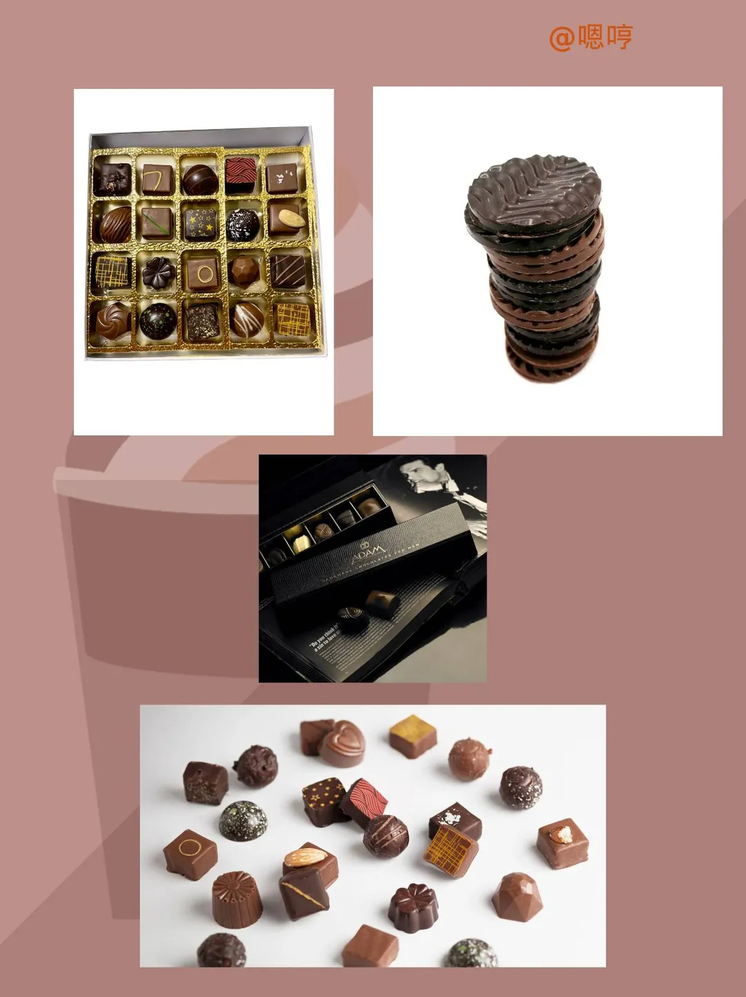 手工松露与夹心巧克力:包括焦糖甘纳许、覆盆子果酱夹心、香草奶油、榛果酱、黑巧甘纳许等,每款均由巧克力师亲手制作。