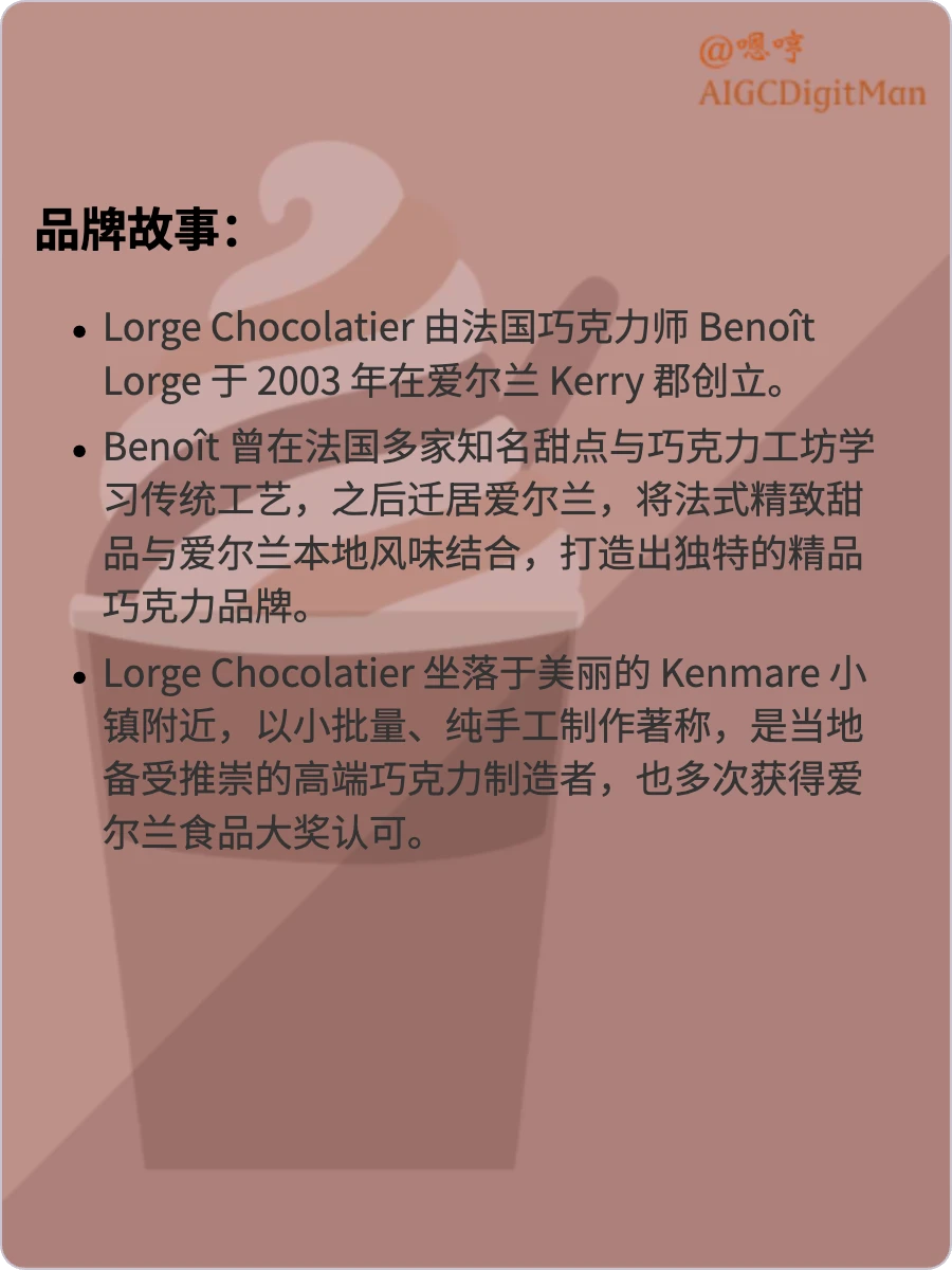 Lorge Chocolatier 坐落于美丽的 Kenmare 小镇附近,以小批量、纯手工制作著称,是当地备受推崇的高端巧克力制造者,也多次获得爱尔兰食品大奖认可。