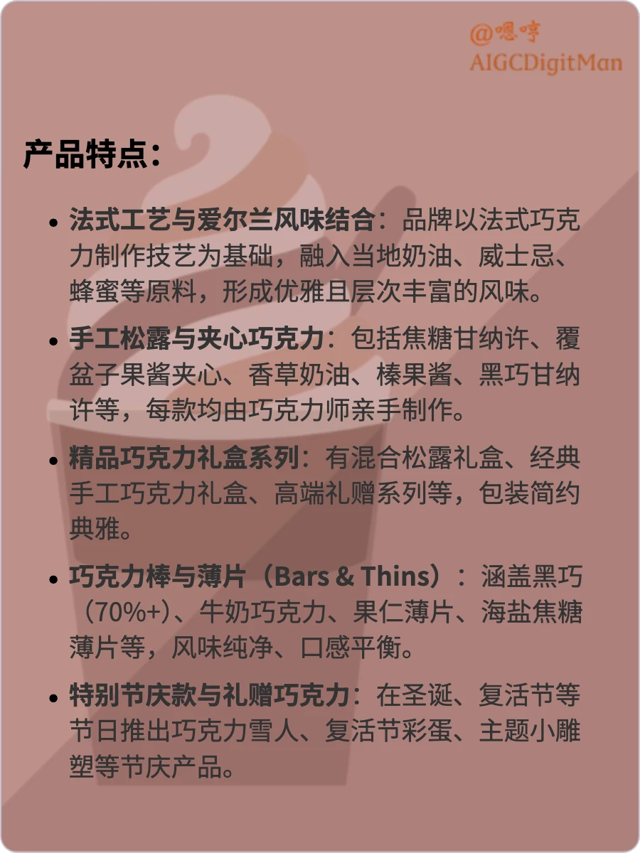 法式工艺与爱尔兰风味结合:品牌以法式巧克力制作技艺为基础,融入当地奶油、威士忌、蜂蜜等原料,形成优雅且层次丰富的风味。