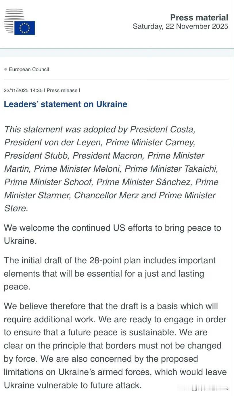欧盟支持乌克兰,并礼貌地反驳了美国的提案。 欧洲领导人:我们欢迎美国为乌克兰带来和平所做的持续努力。 我们认为不应以武力改变边界,并对乌克兰武装部队受到限制表示关切。 涉及欧盟和北约的各项条款的实施,分别需要欧盟成员国和北约成员国的同意。 这份包含 28 点内容的计划初稿包含了对实现公正持久和平至关重要的重要要素。 草案仅供参考,还需要进一步完善。我们愿积极参与,确保未来的和平能持续。 我们重申对乌克兰的持续支持。未来几天,我们将继续与乌克兰和美国密切协调。 俄乌战争