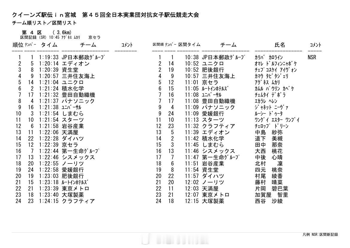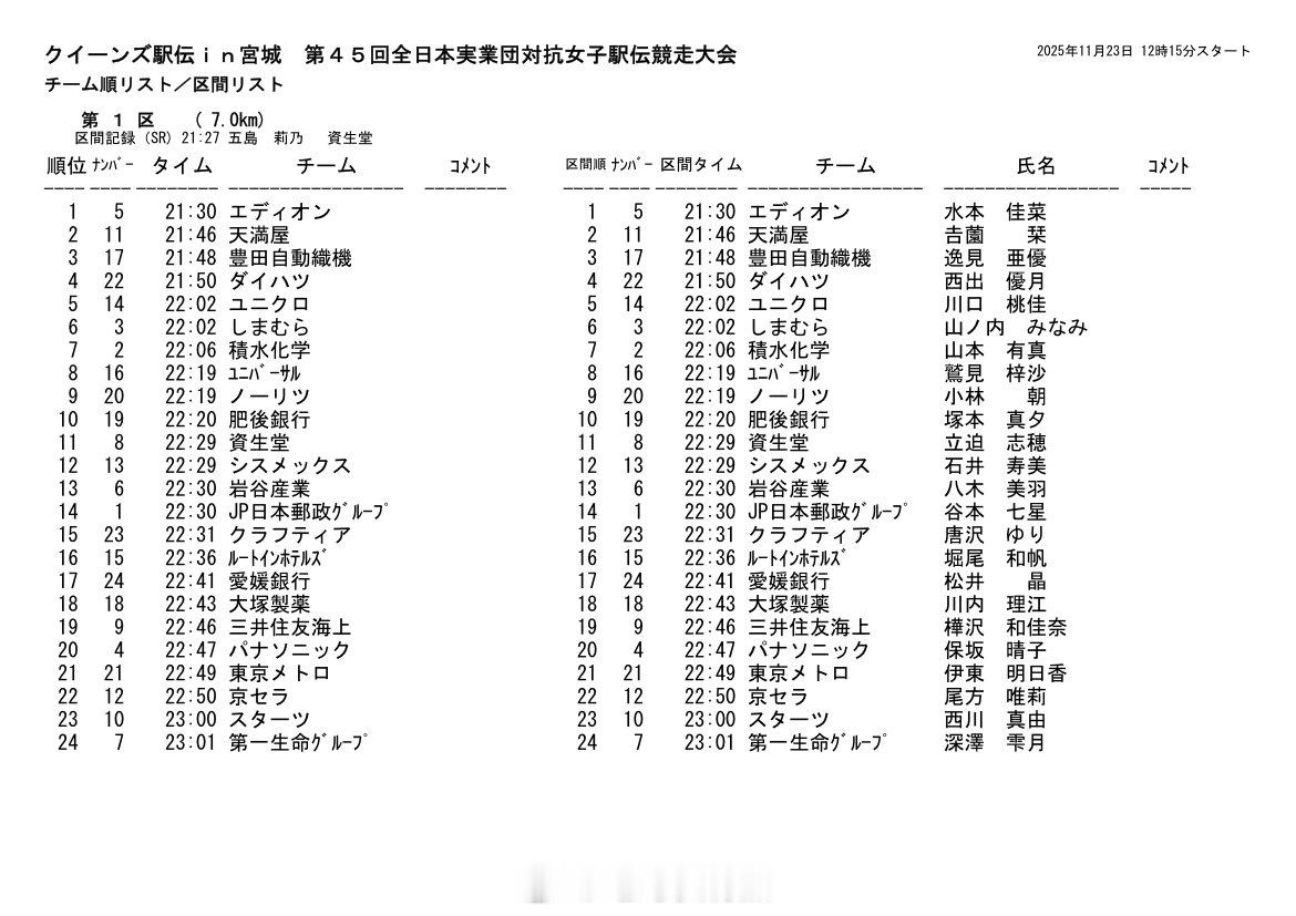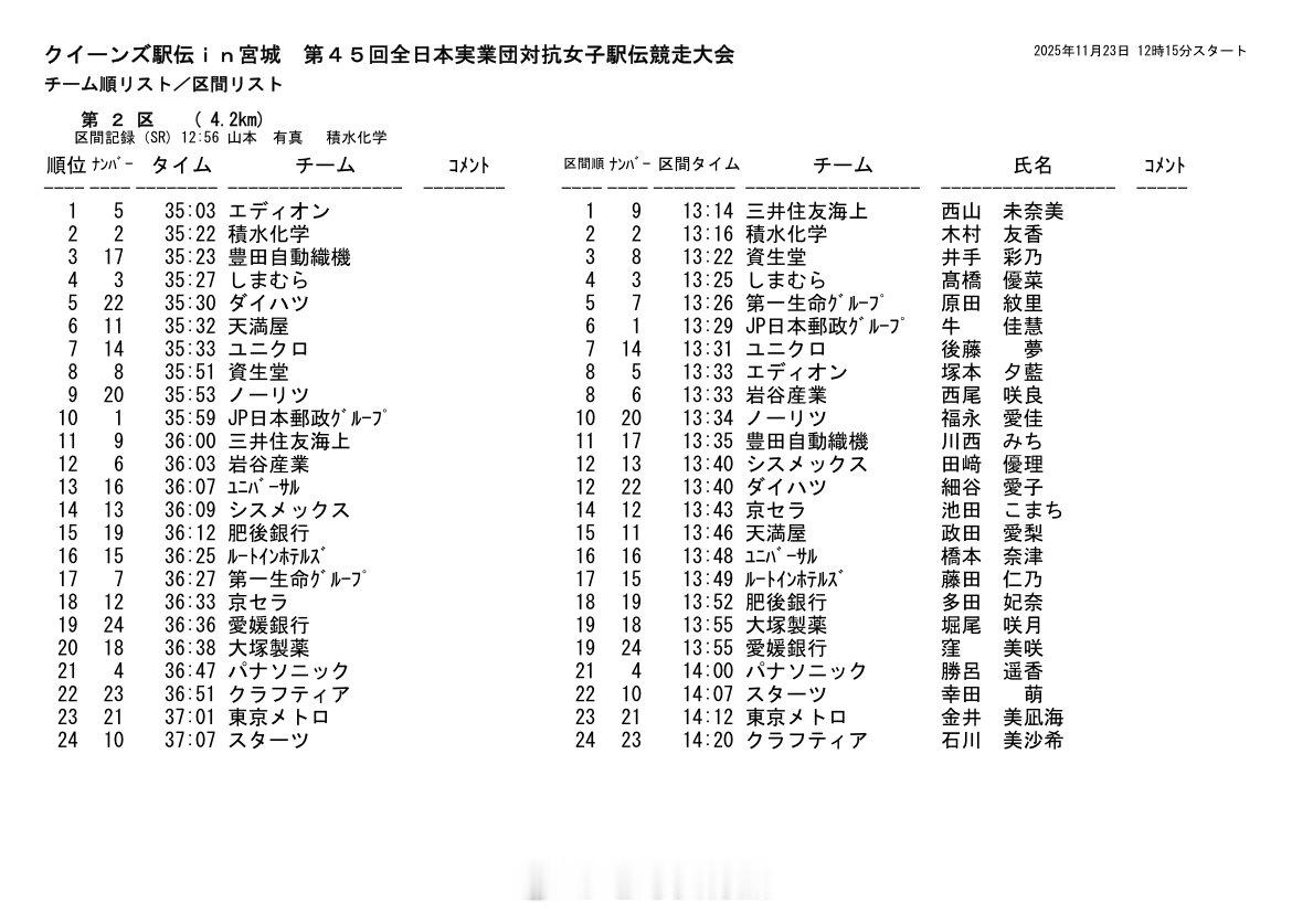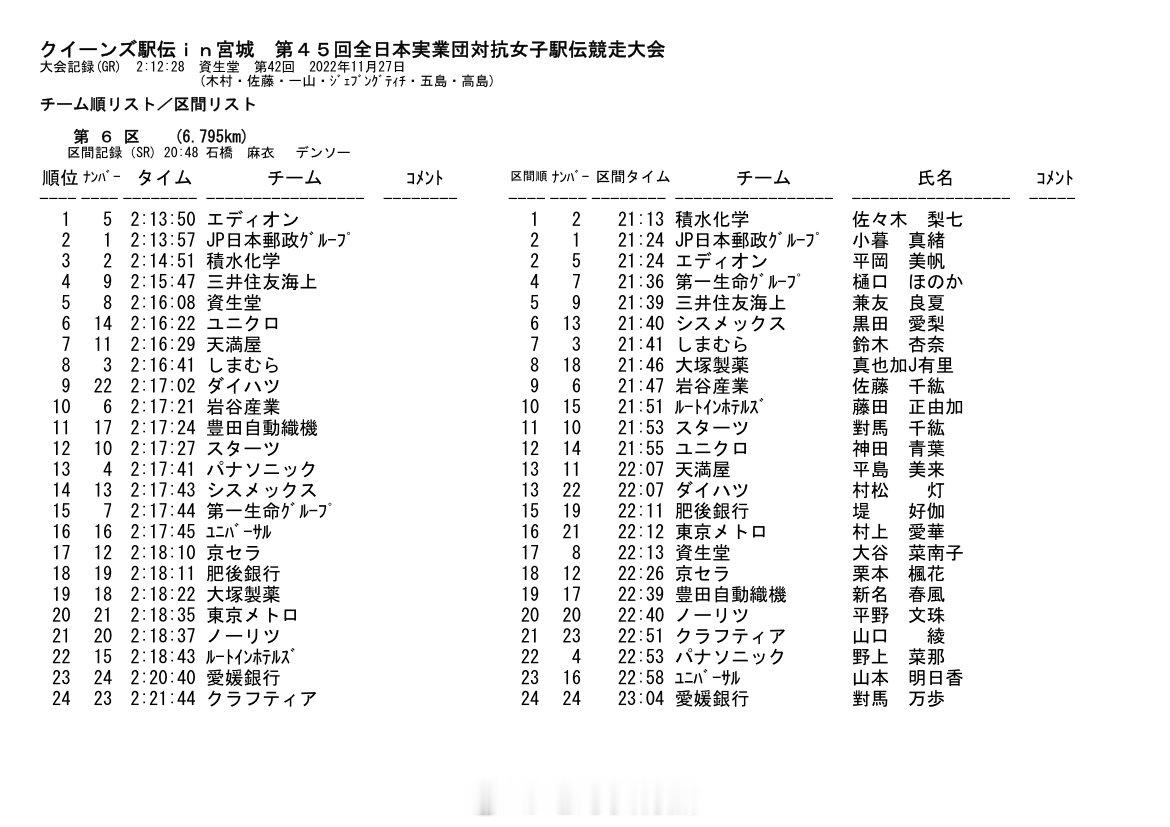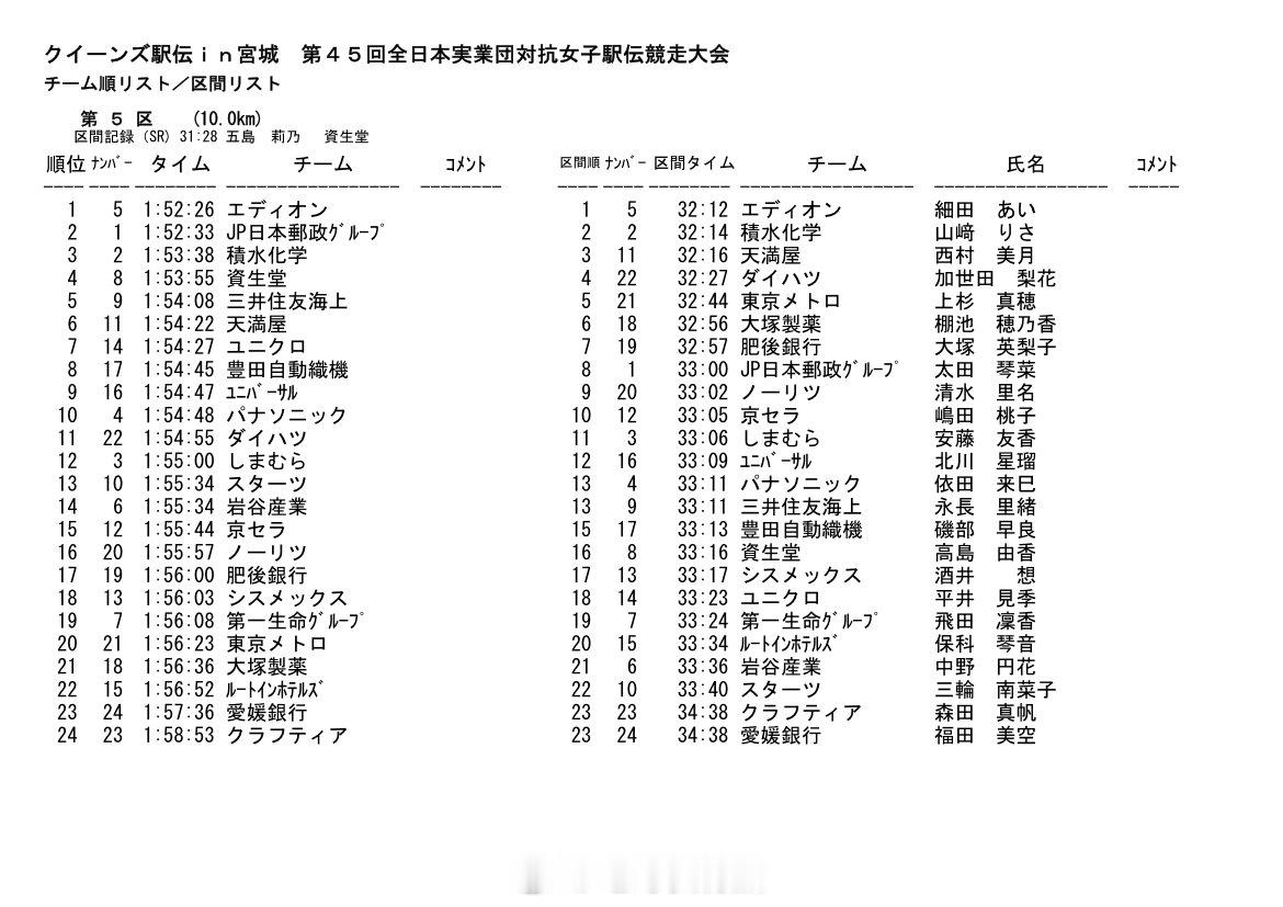 2025第45回全日本实业团女子驿传。1、EDION 爱电王 2:13:502、JP日本邮政集团 2:13:573、积水化学 2:14:514、三井住友海上 2:15:475、资生堂 2:16:086 优衣库 2:16:22区间赏:1区:爱电王 水本佳菜 21:302区:三井住友海上 西山未奈美 13:143区:资生堂 五岛莉乃 32:54 区间新4区:JP日本邮政集团 Caliber Caroline 10:38 区间新5区:爱电王 细田爱 32:126区:积水化学 佐佐木梨七 21:13*3区广中璃梨佳32:56也拿到区间新。第45回全日本実業団対抗女子駅伝競走大会