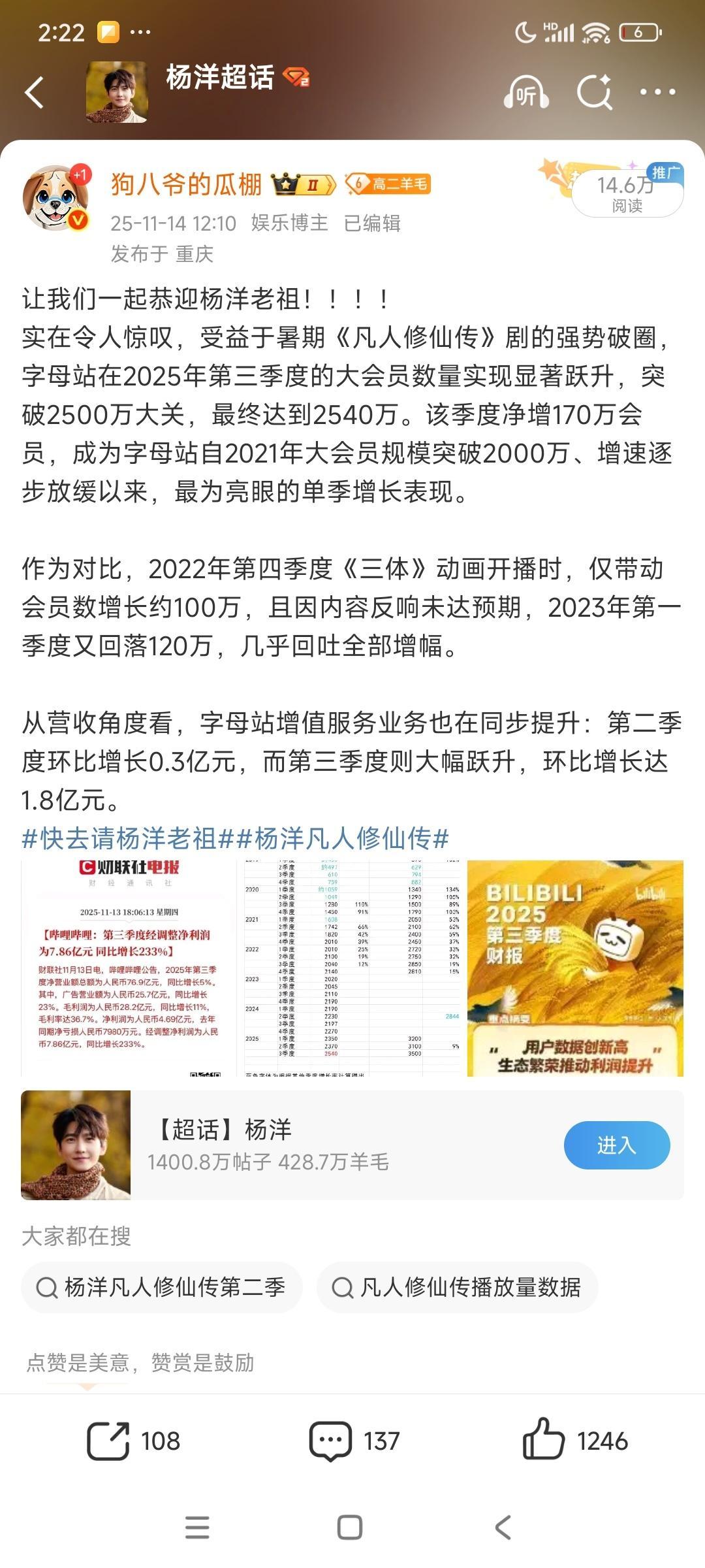 还记得我那个不小心看到浙江卫视,爱上杨洋的《凡人修仙传》的长辈吗?3.0来了。(前情请看p7-p10)之前字母站不是出了一个财报,就是说第三季度,因为杨洋剧凡人修仙传的反哺,导致数据各方面上升站内的事情吗,可能有些人没有真实感,给大家看一下活生生的例子我那个长辈看了剧之后,不过瘾,就去看动漫了,然后也疯狂爱上,甚至说出支持国漫批判起。。。(不可说)笑死我了🤣所以你们知道为啥zb那么着急就要拍凡人剧2了吧,影响力真的很大,杨洋老祖真的太牛了。