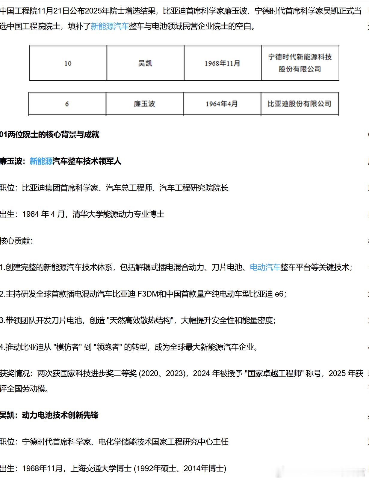 宁德时代和比亚迪的两位首席科学家成为院士了