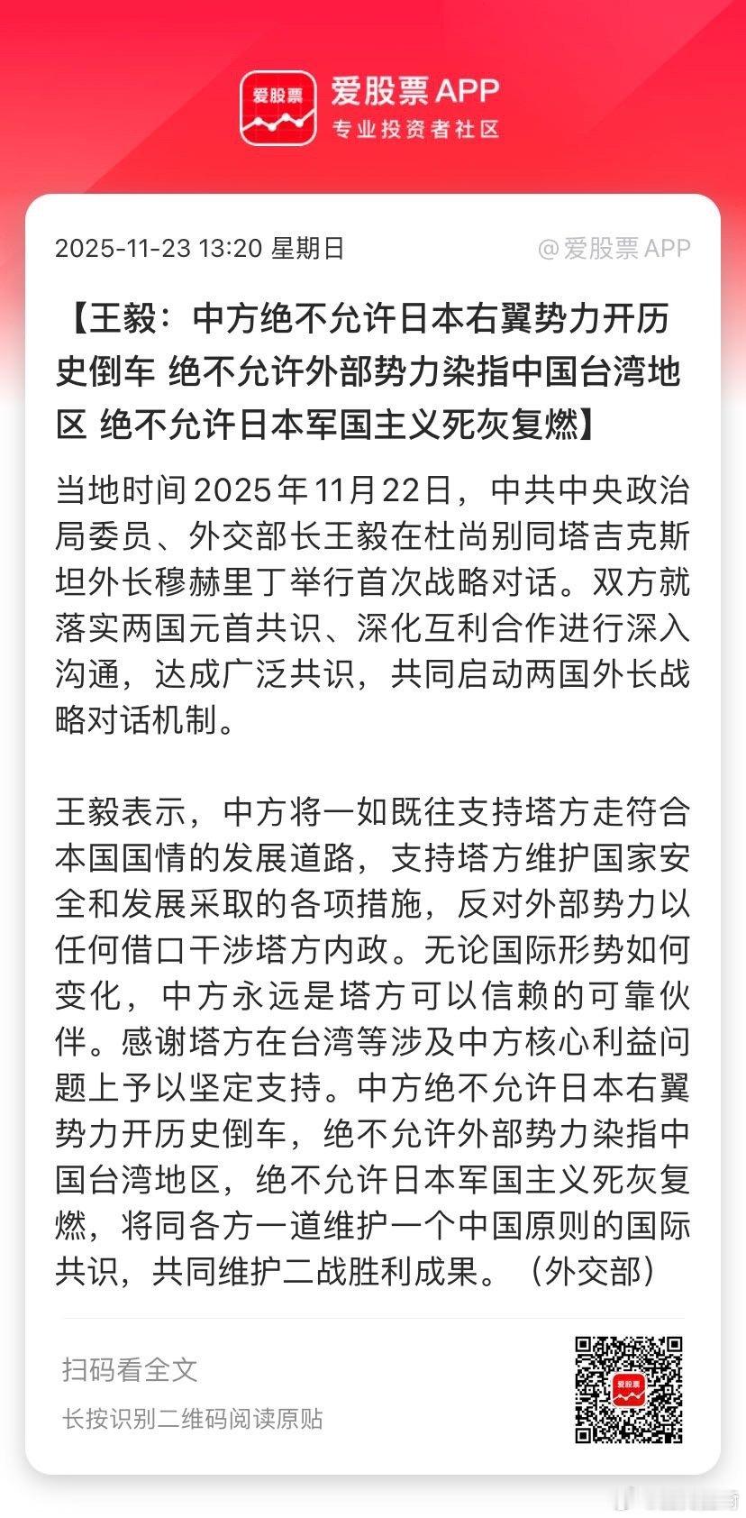 【王毅:中方绝不允许日本右翼势力开历史倒车 绝不允许外部势力染指中国台湾地区 绝不允许日本军国主义死灰复燃】当地时间2025年11月22日,中共中央政治局委员、外交部长王毅在杜尚别同塔吉克斯坦外长穆赫里丁举行首次战略对话。双方就落实两国元首共识、深化互利合作进行深入沟通,达成广泛共识,共同启动两国外长战略对话机制。 王毅表示,中方将一如既往支持塔方走符合本国国情的发展道路,支持塔方维护国家安全和发展...