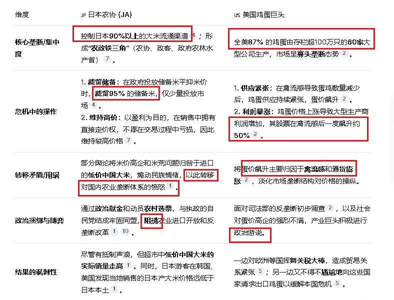 可恶,日本开始抵制我国大米!可最大的问题是,我们给别人背了黑锅。日本这次大米荒和美国的鸡蛋荒是同一路数。 美国那边,87%的鸡蛋被60家养鸡巨头捏在手里;日本这边,90%的大米流通被日本农协一手掌控。这帮人玩的是什么把戏呢?就是一边制造短缺,一边维持高价。 美国鸡场发现,闹了禽流感之后,鸡少了,蛋价反而疯涨,赚得比平时还多!这下可好,他们干脆“主动”加速扑杀,让蛋鸡数量暴跌,鸡蛋价格一飞冲天,公司股票也跟着暴涨——这“灾难财”发得真是明明白白。 日本农协也不甘示弱,政府好不容易放出储备米来平抑粮价,他们反手就截留了95%,只让一点点米流入市场。这哪是缓解危机,这分明是火上浇油! 更可气的是,他们利用甩锅隐藏自己,美国把蛋价飙升怪到禽流感和通胀头上;日本呢?直接把我们中国大米当靶子,煽动民众情绪,说什么“饿死不吃中国米”——好家伙,你们自家农协在背后数钱数到手软,黑锅倒让我们来背? 这套玩法能持续,是因为他们早就织好了一张利益铁网,日本农协、政客、政府官僚,三方绑得死死的:农协控制渠道和选票;政客靠农协保住席位;官僚们则忙着争取预算和权力。 结果就是,谁也不能改革米价,之前日本有位农林水产大臣想绕过农协直接卖储备米,立刻就否决了。 所以啊,什么天灾、什么进口威胁,都是表面文章。根子就在于这些垄断集团在发国难财:他们刻意维持市场的紧张状态,自己赚得盆满钵满,却把矛头引向外国。最后倒霉的,永远是本国的普通老百姓。哪有什么粮食危机,不过是一场精心导演的“收割戏码”罢了。
