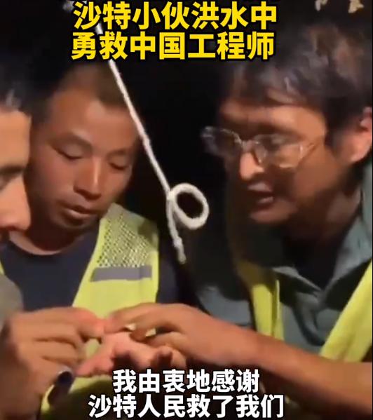 上人民日报了!沙特阿拉伯,两名中国工程师开车途中遭遇洪水车辆不幸侧翻,危机时刻,沙特青年冲入激流救人,拉出一个后,关切的询问是否其他人,在得到肯定的答复后,再次冲入激流中救人…… 2025 年 11 月 16 日,沙特阿拉伯哈伊勒省的天空没征兆地变脸,短短两小时的降雨量就突破了当地季度平均水平。 暴雨在干涸的土地上迅速汇成洪流,公路瞬间变成湍急的河道,两名工程师当时正驾车前往项目工地,他们负责的是中沙合作新能源电站的设备调试工作。 洪水顺着地势快速上涨,车轮刚接触积水就开始打滑,紧接着一股激流猛地撞击车身,整辆车失去控制,在水面上打了个转后重重侧翻,半截车身被洪水吞没,车窗玻璃瞬间碎裂,冰冷的洪水疯狂涌入车厢。 “当时脑子一片空白,只听见水流的轰鸣声。” 事后获救的工程师回忆时仍心有余悸。两人被困在变形的车厢里,安全带死死卡住身体,洪水已经漫到胸口,每一次呼吸都变得艰难。 他们尝试推开车门,可外面的水压太大,无论怎么用力都纹丝不动,只能眼睁睁看着水位一点点上升,绝望感越来越强烈。 就在这危急时刻,三个身影出现在洪流中。他们是附近村庄的沙特青年,当时正开车路过,看到侧翻的车辆后,想都没想就跳下车冲了过去。 穆罕默德第一个扎进激流,洪水几乎没过他的肩膀,每前进一步都要对抗湍急的水流。他抓住车身稳定住身形,用石头砸开已经变形的车窗,先把靠近车窗的一名工程师拉了出来。 “还有人吗?” 刚把人带到安全地带,穆罕默德抹了把脸上的雨水,用不太流利的英语急切询问。得到 “还有一位同事被困” 的答复后,他没片刻犹豫,转身再次冲入激流。 这时候的洪水比刚才更猛,车身被水流冲击得不停晃动,阿卜杜拉和卡里姆赶紧在岸边找了根粗壮的树干,一端固定在路边的石头上,另一端递给穆罕默德,形成一道简易的安全绳。 三人合力协作,穆罕默德在车内安抚被困工程师的情绪,指导他解开安全带,在岸边使劲拉拽。 洪水不断冲击着他们的身体,脚下的泥沙也在不停下陷,每一个动作都耗费着巨大的体力。 经过十几分钟的艰难救援,第二名工程师终于被成功拉出车厢,当两人都平安抵达岸边时,周围已经聚集了不少闻讯赶来的沙特民众,大家纷纷递上毛巾和热水,脸上满是关切。 这场冒死救援的全过程,被路过的车辆行车记录仪完整记录下来,视频传到网上后迅速刷屏。 网友们被沙特青年的勇敢无畏深深打动,有人留言 “危险时刻挺身而出,这就是最纯粹的善良”,还有人说 “不分国界的救援,才是友谊最好的证明”。 事件发生后,中国驻沙特大使馆第一时间介入,向他们颁发了表彰证书和慰问金,高度赞扬他们 “用勇敢诠释了人道主义精神,用行动见证了中沙友谊”。 大使馆还通过官方渠道,向沙特方面表达了诚挚的感谢,强调这场救援不仅挽救了两位工程师的生命,更让中沙两国人民的心贴得更近。 三位沙特青年的救援行为,看似是一次偶然的善举,实则是中沙友谊的必然体现。 当危险来临,他们没有考虑国籍和语言的差异,只想着救人于危难之中,这种发自内心的善良,是跨越国界的共同语言。 而中国驻沙特大使馆的及时表彰,以及两国网友的热烈响应,也让这份善意得到了最温暖的回应。