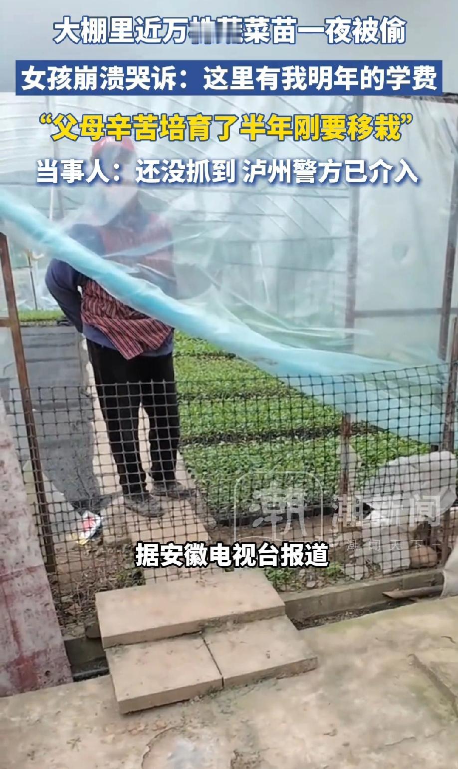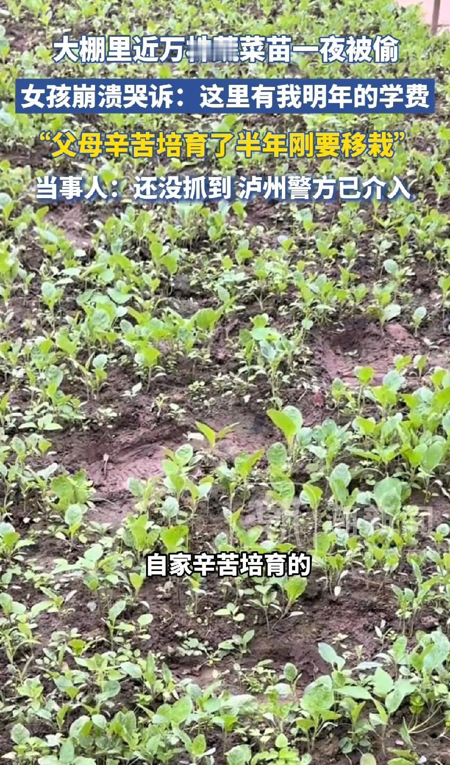 谁能想到!四川泸州,一家人为了给女儿凑学费,花费半年时间在大鹏里辛辛苦苦培育了近万株菜苗,却在就要移栽时,被小偷半夜偷走。女孩看到空荡荡的苗床,当场哭得喘不过气,父母更是无助的抹泪。网友:偷的不只是菜苗,更是一家人的希望和未来。 (来源:潮新闻) 四川泸州古蔺县城郊的田埂上,那十来个大棚曾是邓同学一家的盼头。 从春天开始,邓同学的父母就一头扎进棚里,培育着西红柿、辣椒、黄瓜的早市苗,这一忙就是整整半年。 每天天不亮,老两口就扛着水壶去浇水,中午盯着温度计控温,傍晚还要给苗床盖保温膜,连吃饭都得轮着来,手指头磨出了厚厚的茧子。 邓同学大学毕业就回了乡,跟着父母一起伺候这些苗,每株苗的嫁接、打药时间都记在小本子上,看得比啥都金贵。 这批近万株的菜苗,再过几天就能移栽卖给菜农,按市场价能卖三四万,不仅是全家一年的主要收入,还藏着邓同学明年上研究生的学费。 可谁也没想到,一场劫难悄悄降临。事发那天凌晨三点,天黑得伸手不见五指,一辆小货车停在村口,几个人戴著口罩,拎着剪刀、手电和编织袋,蹑手蹑脚绕到大棚后方——特意避开了正面监控。 他们动作熟练,十分钟就清空一个棚,装满一车就跑,连棚膜都没碰坏。 第二天一早,邓同学推开棚门,当场就愣在原地。原本整整齐齐的苗床空空荡荡,只剩下一地被踩断的秧苗和散落的塑料盘。 看着半年心血一夜归零,她蹲在地上哭得喘不上气,声音都在发抖:“这是我明年的学费啊!” 父母赶来后,老两口蹲在棚角,捧着沾着泥土的塑料盘,眼泪止不住地掉,连饭都吃不下。 家人赶紧报了警,警方调监控发现,小货车挂的是假牌照,早就开进了贵州地界。 邓同学把自己家的遭遇视频发到网上,很快就被千万人看到,网友们又气又心疼,有人要转账帮忙,有人想帮忙找贼,本地菜农也纷纷赶来,想把剩下的苗全包了。 这件事让人又气又暖。气的是小偷太狠心,专挑农民的血汗钱下手,他们偷的不只是菜苗,更是一家人的生计和孩子的未来;暖的是网友和乡亲们的善意,让这个遭难的家庭感受到了温暖。 农民种地本来就不容易,起早贪黑半年才盼来收成,却被不法分子钻了空子。 希望警方能尽快抓到小偷,让他们付出应有的代价,也希望农村的安防能再加强些,多装些监控、多些巡逻,别让老实人的辛苦白费。