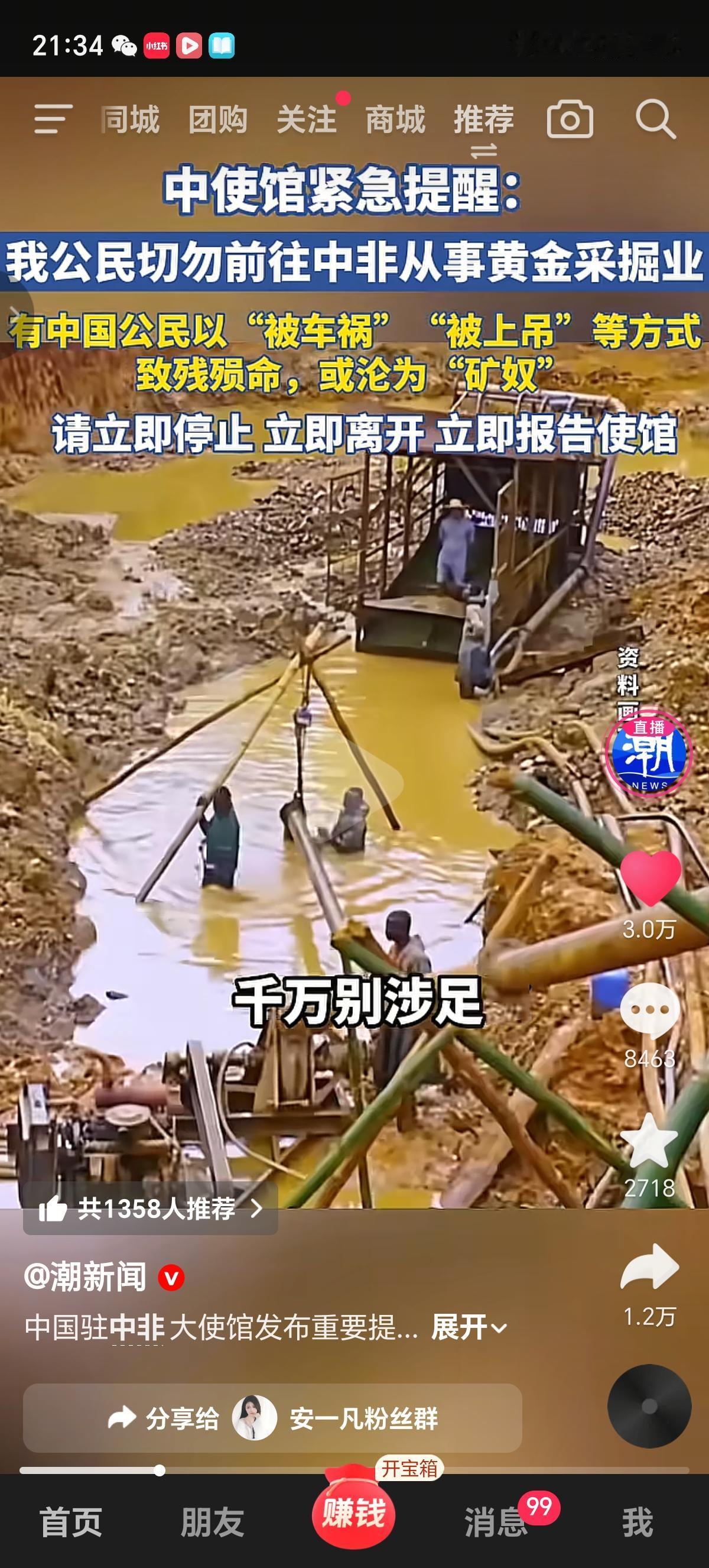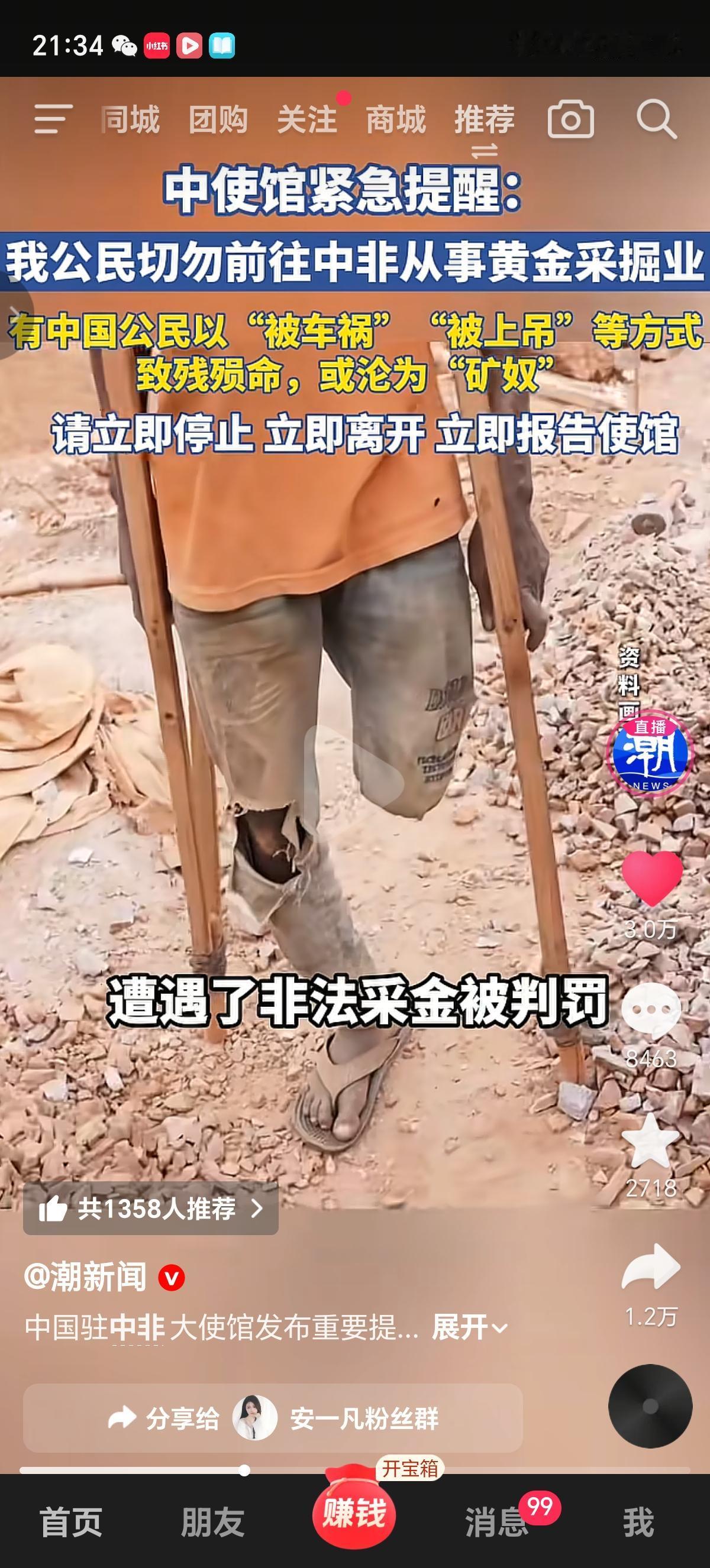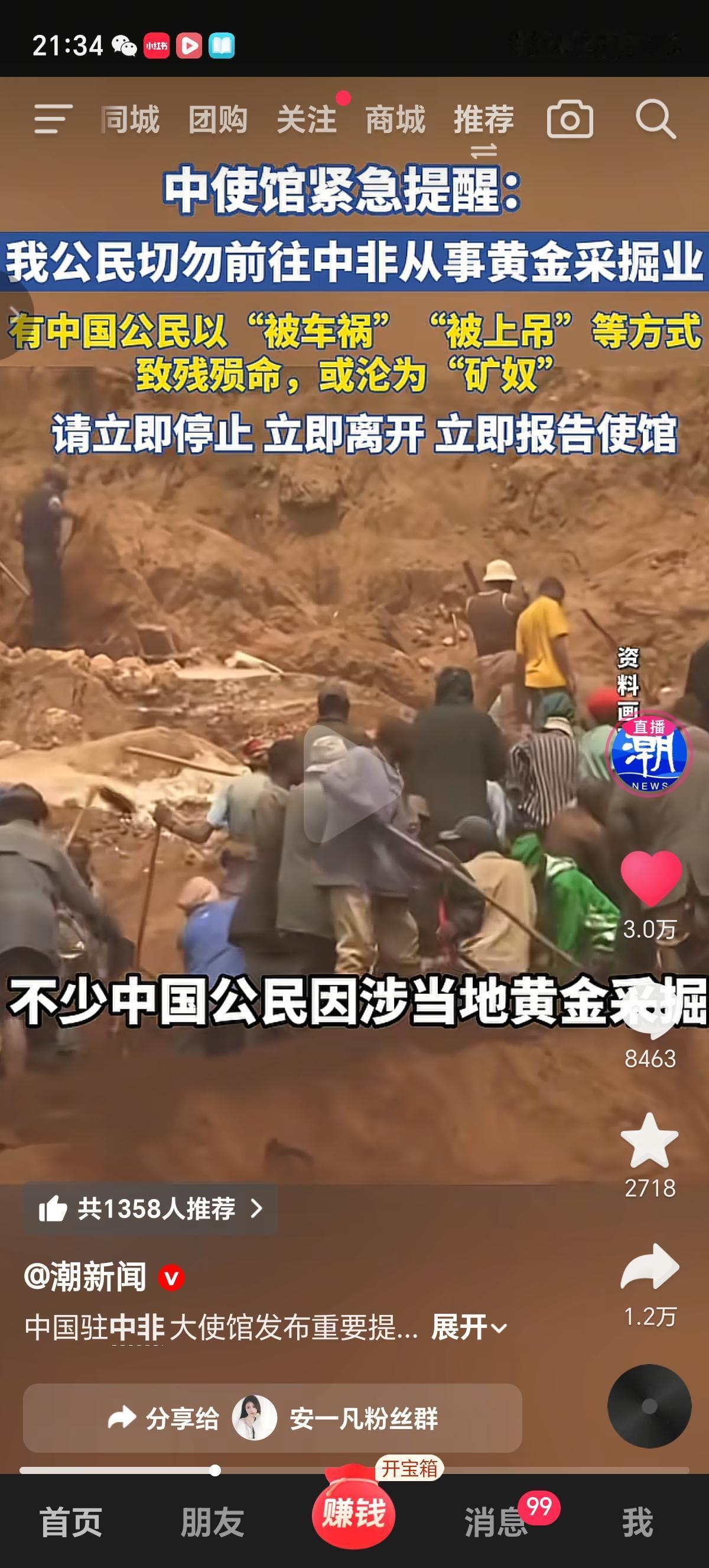 有中国公民以“被车祸”、“被上吊”等方式致残殒命,或沦为“矿奴”,中国驻中非使馆紧急提醒,我国公民切勿前往中非从事黄金采掘业,请立即离开! 要知道中非除了首都之外,很多外省都是安全等级极高的红区,这些地方本就不适合务工。所以使馆特意强调,大家千万别往这些红区跑,更别碰黄金采掘这种高风险行业。 要是现在已经有人在中非红区做相关活动,可别抱着侥幸心理拖延了。赶紧停下手里的活儿,收拾好东西尽快离开危险区域,而且一定要记得及时向使馆报告自己的情况。使馆说了会尽全力提供必要的协助,这可是身处险境时最靠谱的后盾。 有个老母亲去中非处理年轻儿子后事时,哭着说这辈子最后悔的就是没拦住儿子去中非挖金,这句话听得人鼻子发酸,一个家庭的希望就这么没了,这样的悲剧真的再也经不起重演。 出门在外,赚钱从来都不该以生命为代价。这条提醒也希望大家多转发多提醒,让更多人看到,别再有人因为一时的贪念,把自己推向无法挽回的深渊。
