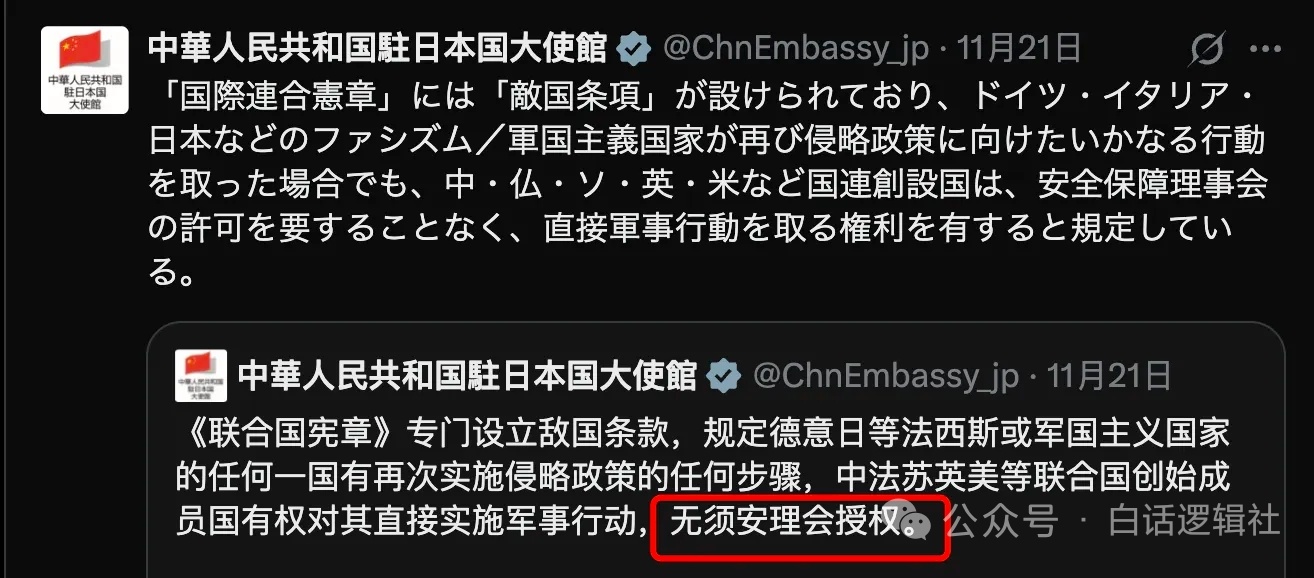 中国驻日大使馆用中日双语发帖,引用该条款对日本发出迄今为止最强警告,贴文再次声明:《联合国宪章》专门设立敌国条款,规定德意日等法西斯或军国主义国家的任何一国有再次实施侵略政策的任何步骤,中法苏英美等联合国创始成员国有权对其直接实施军事行动。