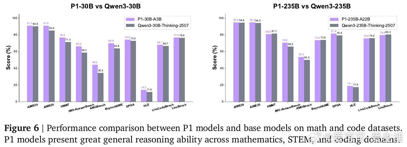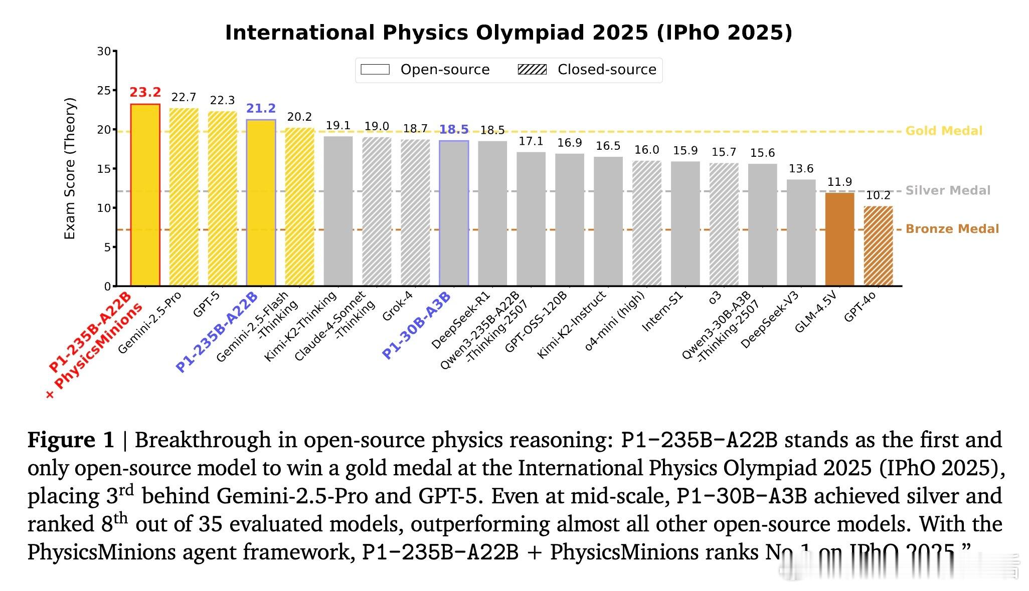 [LG]《P1: Mastering Physics Olympiads with Reinforcement Learning》J Chen, Q Cheng, F Yu, H Wan... [Shanghai AI Laboratory] (2025) P1:首个开源物理奥林匹克级别强化学习大模型,突破科学级推理边界!近期大语言模型(LLMs)已从简单解题跃升到科学级推理,而物理学是最严苛的试金石——它将符号与现实紧密绑定,是现代科技基石。本文推出了P1系列模型,专注于物理奥赛难题的强化学习训练,标志着AI科学推理的里程碑。核心成果:- P1-235B-A22B成为首个在2025年国际物理奥林匹克(IPhO 2025)夺得金牌的开源模型,2024/2025年共斩获13场国际/区域物理竞赛12金1银。- P1-30B-A3B中型模型也获得银牌,优于几乎所有开源对手。- 配合PhysicsMinions智能代理框架,P1-235B-A22B+PhysicsMinions实现IPhO 2025综合排名第一,13项竞赛平均成绩最高。- 除物理外,P1系列在数学、编码等推理任务中表现优异,显示出极强的泛化能力。技术亮点:- 纯强化学习后训练:采用多阶段RL框架,动态调整学习难度及探索空间,克服稀疏奖励、熵崩溃等训练瓶颈,实现持续性能提升。- 结构化物理数据集:精心构建含5,065道题的高质量物理奥赛文本数据,结合专家解答与规则可验证答案,确保训练监督的科学严谨。- Hybrid验证机制:结合符号计算和模型验证,保障答案判定的精准与广泛覆盖。- 代理式推理框架PhysicsMinions:模拟人类物理学家“解题—自检—修正”流程,多轮迭代提升解题深度和准确度。- 训练稳定性保障:采用截断重要性采样缓解训练推理策略差异带来的偏差,确保优化过程稳定高效。性能表现:- P1-235B-A22B在IPhO 2025理论考试中得分21.2/30,位列全球前三,仅次于Gemini-2.5-Pro和GPT-5,领先所有开源模型。- 在中国物理奥林匹克(CPhO 2025)理论赛中,P1-235B-A22B得分227/320,超越最高人类得分199分,展现出超越人类精英的实力。- 结合PhysicsMinions后,P1模型在13项奥赛综合评测中均领先,实现了开源领域前所未有的统治力。泛化能力:P1不仅专精物理,其数学(包括IMO难度)、STEM和编程推理能力均显著优于基础模型,表明强化学习后训练在提升科学推理的同时,增强了模型的跨领域迁移力。深度思考:“科学推理的力量不仅在于准确解答,更在于能否贯通自然法则与抽象逻辑。”P1的成功证明,AI通过强化学习与多轮自我校验,能够迈向真正的科学智能,助力未来物理研究的突破。开放生态:P1提供端到端开源方案,涵盖模型、训练算法、评测基准与代理推理框架,期待全球科学与AI社区共筑未来。详情阅读论文:arxiv.org/abs/2511.13612