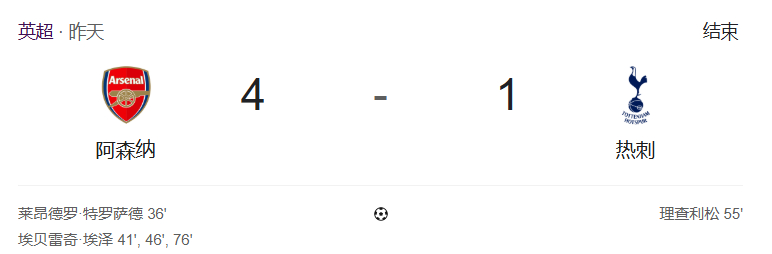11月24日 北京时间00:30,阿森纳在英超迎战热刺。上半场,特罗萨德转身破门首开记录,埃泽爆射破门再下一城;下半场,廷贝尔助攻埃泽破门双响,里沙利松吊射扳回一球,特罗萨德助攻埃泽破门上演帽子戏法。最终,阿森纳4-1战胜了热刺。