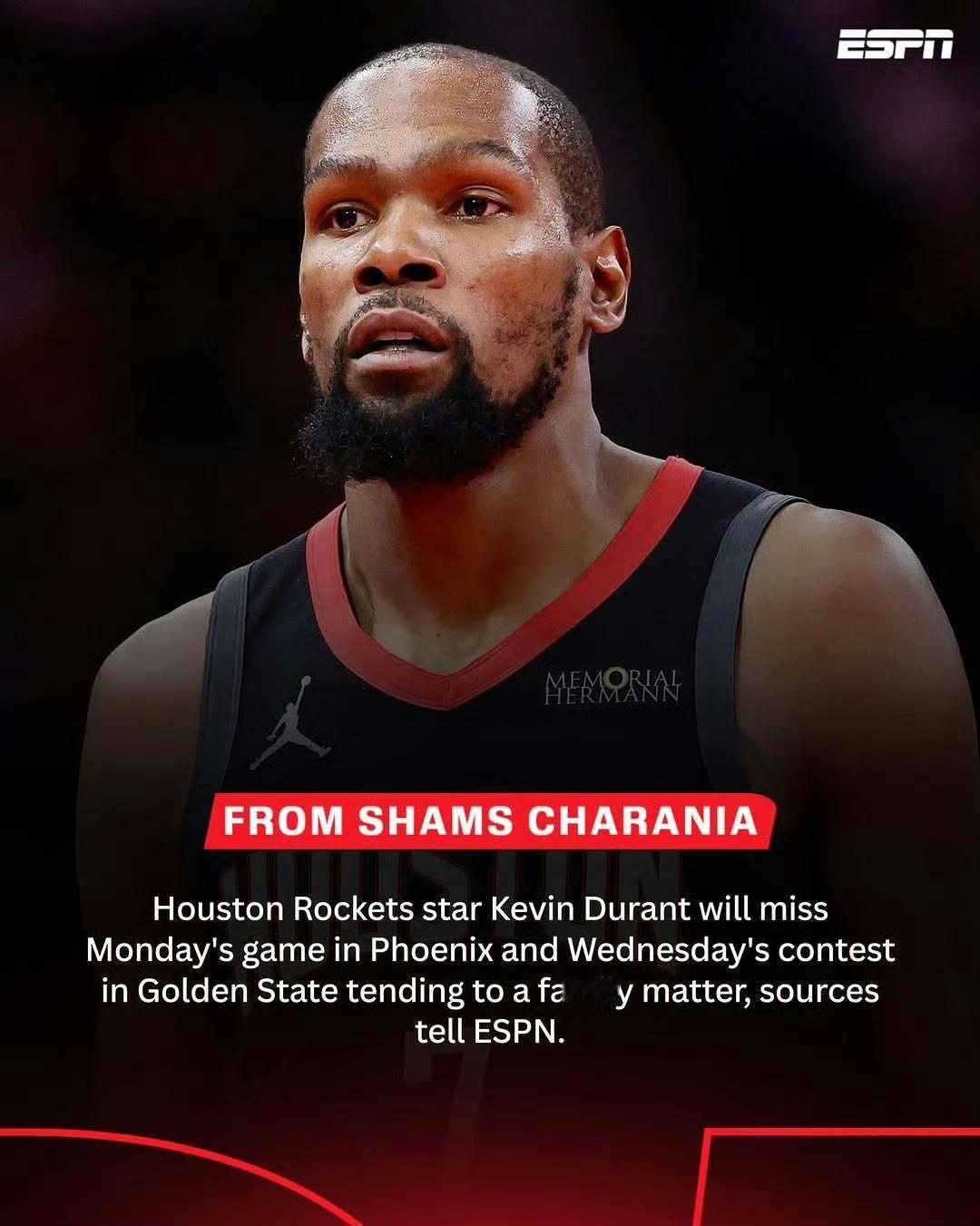 ESPN👀 杜兰特因家庭原因将错过客场对阵太阳以及勇士的比赛。