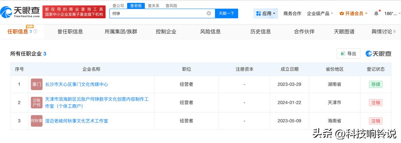 【何秋亊演唱会后注销名下2家企业 何秋亊名下仅关联1家存续企业】何秋亊说演唱会没收到应得的报酬 近日,何秋亊在直播中表示,其演唱会收入为固定场次费用加机酒报销,未参与门票收入的分成。据报道,此前,何秋亊因演唱会造型引发抄袭争议,随后何秋亊工作室发文向汪苏泷及其团队道歉。 天眼查App显示,何秋亊(何铮)名下关联3家企业,仅1家长沙市天心区事门文化传媒中心为存续状态,其余2家企业均于今年8月注销。 天眼查信息: