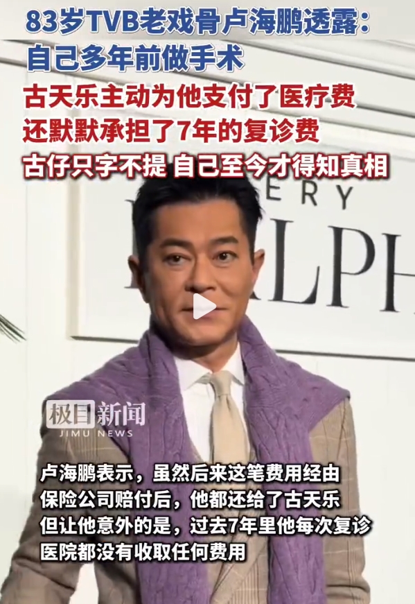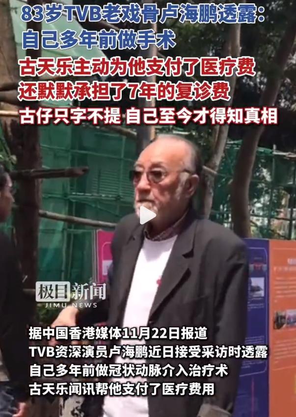 近日,TVB资深演员卢海鹏接受采访时透露,自己多年前做冠状动脉介入治疗术,古天乐闻讯帮他支付了医疗费用,令他感动不已。而更让卢海鹏感到暖心的是,他不久前才知道,自己术后7年间的复诊费用,也都是古天乐悄悄帮付的。