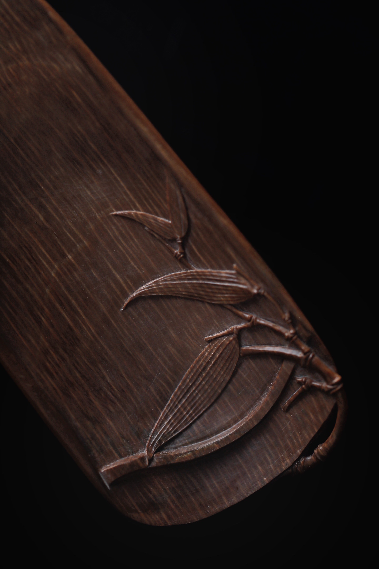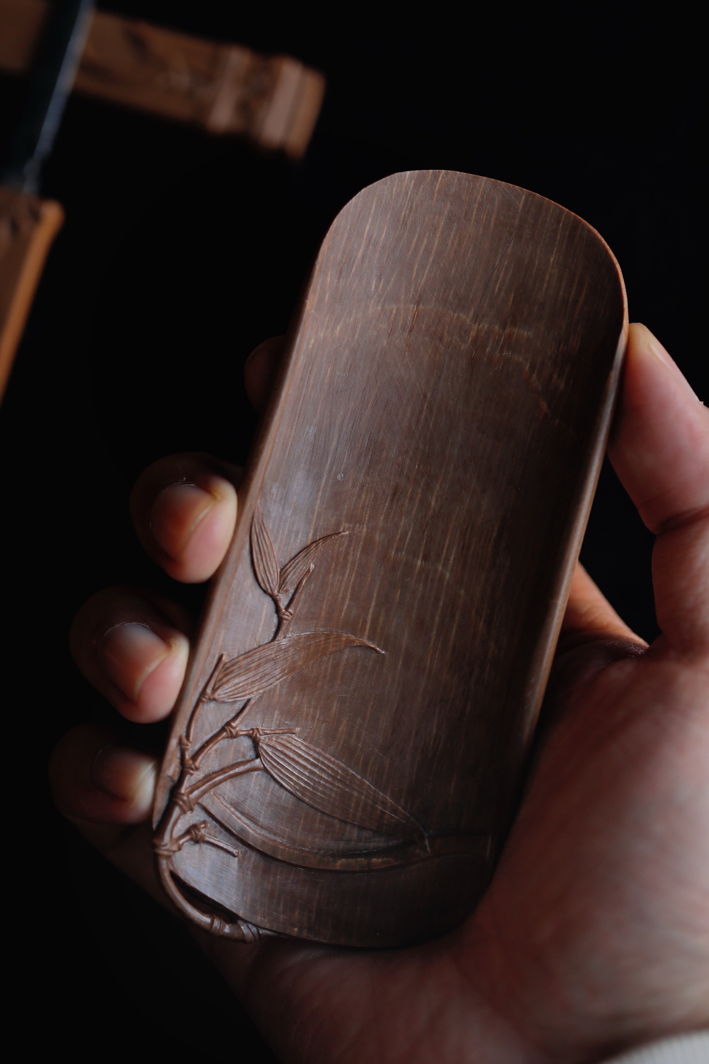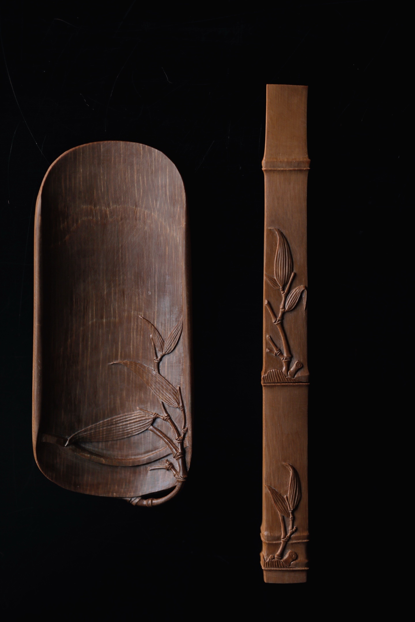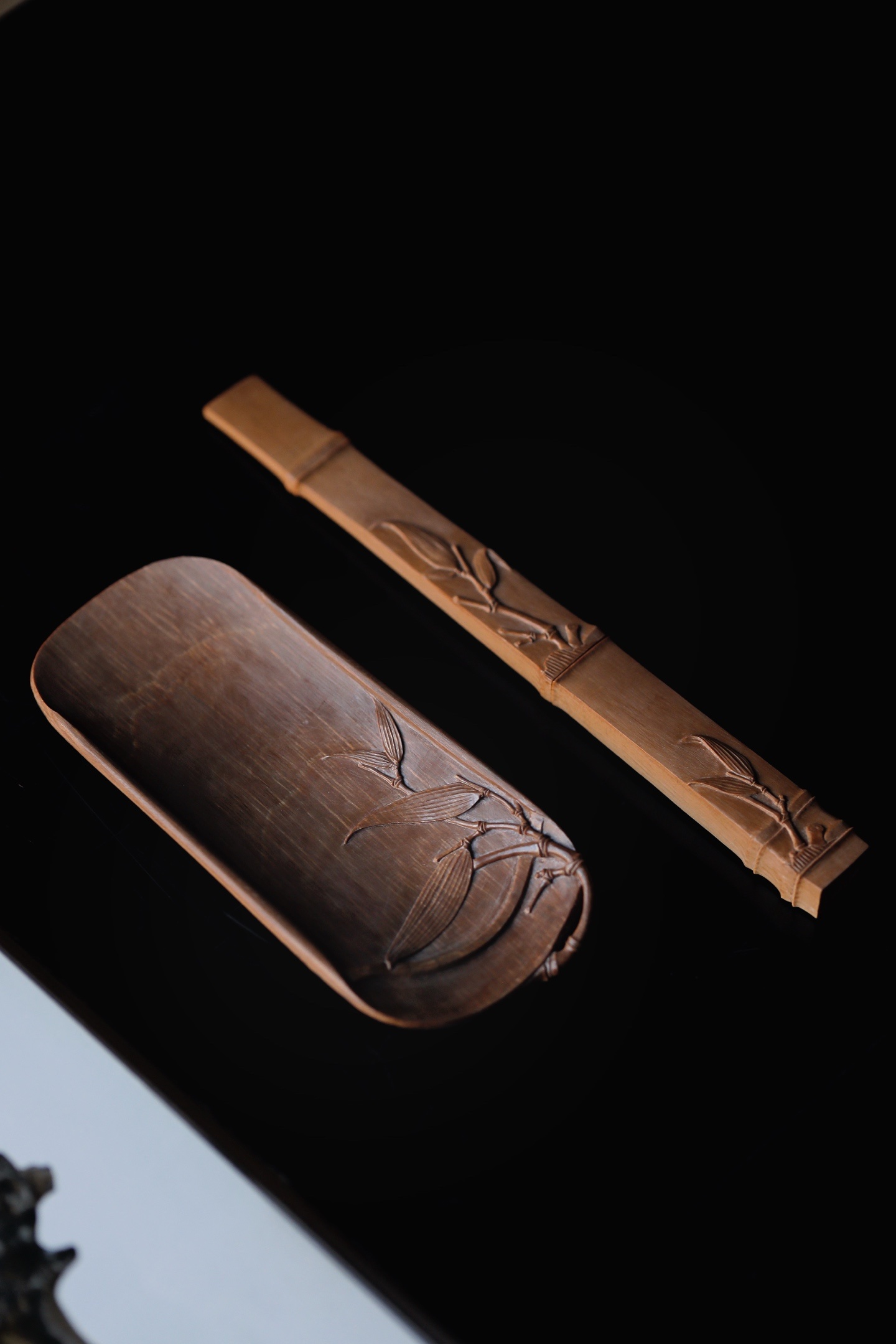 猛犸咖料 | 竹境 茶则两件套整料清刀雕刻,饰以两三片枝叶,仿生自然。形象惟妙惟肖,造型生动。以谐音寓意,知足常乐之意,收藏把玩,辅以茶事,陶冶心境。茶针:17.7cm 41g茶则:13*5.8*1cm 38g