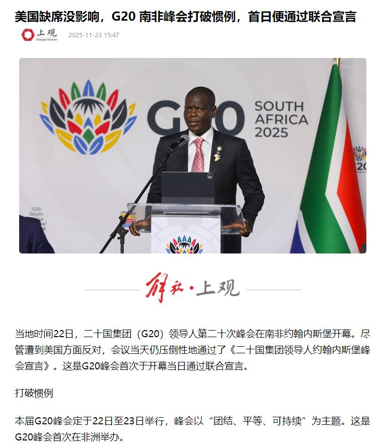 美国这下是真的破防了! 当地时间 11 月 22 日,南非约翰内斯堡 G20 峰会刚开幕,就给了它一记响亮耳光,本该压轴的联合宣言,破天荒首日表决且压倒性通过,全程没纳入美方意见,连它明确反对的气候议题都被稳稳写进文件。 而且,这次G20峰会可不光是提前通过宣言那么简单,背后国家间的利益争夺、国际规则的改动,还有全球怎么一起做事的方式,都在悄悄变样。 特朗普政府拿“南非白人农民遭种族灭绝”当借口不参会,说白了就是没看清非洲的重要性,还想抢资源控制权。 南非要解决种族隔离留下的土地问题,推出了相关法案,美国却拿这事做文章。 南非想让资源生产国多赚点钱,搞了个矿产开发的规则,直接动了美国主导的资源分配蛋糕,再加上南非在国际上有自己的独立立场,和美国的中东政策对着干,矛盾自然越来越深。 金融方面也吵得厉害,峰会宣言里说要调整国际货币基金组织的话语权、让债主一起帮穷国还债,这直接碰了美国在全球金融里的核心好处,难怪白宫开会前逼着盟友反对,结果没人听它的。 峰会第一天就通过宣言,这事儿以前从没发生过,说明G20做事规则变了大样。 南非不管“必须所有人同意”的老规矩,改成“来了的国家投票同意就行”,把美国排除在决策外,连交接主席国都加了新规矩,谁缺席就往后顺延,打破了以前欧美说了算的潜规则。 就算美国没来,各国还是达成了122条共识,欧盟拿47亿欧元搞清洁能源,中国也承诺1000亿元支持可再生能源,大家都在重新搭合作的圈子,这种不靠美国的做法,其实是国际合作机制自己在升级。 这是非洲第一次主办G20,南非直接把发展中国家关心的事放到了核心位置。峰会上定了支持非洲发展的倡议,要让非洲的可再生能源装机量翻三倍,还准备搞个100亿美元的基金应对气候变化,甚至把非洲“人人为我,我为人人”的理念写进了宣言,让全球治理不再只听欧美那一套。 南非还帮非洲争取权益,不让非洲只卖原材料,要搞深加工多赚钱,这和“一带一路”倡议能互相配合,欧盟也投了几百亿兰特,其中五分之一专门支持南非搞制造业,看得出来非洲不再是只能听别人安排,现在也能参与定规矩了。 这次峰会也暴露了世界秩序的大变化。现在新兴国家的经济总量占全球一半以上,但在国际货币基金组织里说话的分量还不够。 南非提出要成立专门机构评估债务问题,就是想削弱美国在金融领域的控制权,以后全球经济可能不再是少数国家说了算,而是大家一起商量着来。 数字经济方面,中国和欧盟一起提的跨境数据流动规则赢了日本的方案,人工智能该怎么合规用也被写进了议程,这让发展中国家也能参与到新技术的规则制定中。 当然问题也不少,宣言里说慢慢不用化石能源的说法没那么强硬,私人债主不太愿意参与债务重组,以后美国可能还会报复。 但不管怎么说,变革的势头已经挡不住了。南非用实际行动证明,没有霸权国家主导,各国也能合作办事,以后G20可能分成两条线做事。 这次峰会真正的意义,是重新说明白了啥叫领导力,不是能一票否决,而是能让大家达成共识;不是能控制会议内容,而是能解决大家的实际需求。 美国选择不参会,非洲却用行动告诉世界:国际合作的生命力,就在于能听不同国家的声音,在不一样的想法里找到大家都认可的好处,这才是全球合作该有的样子。