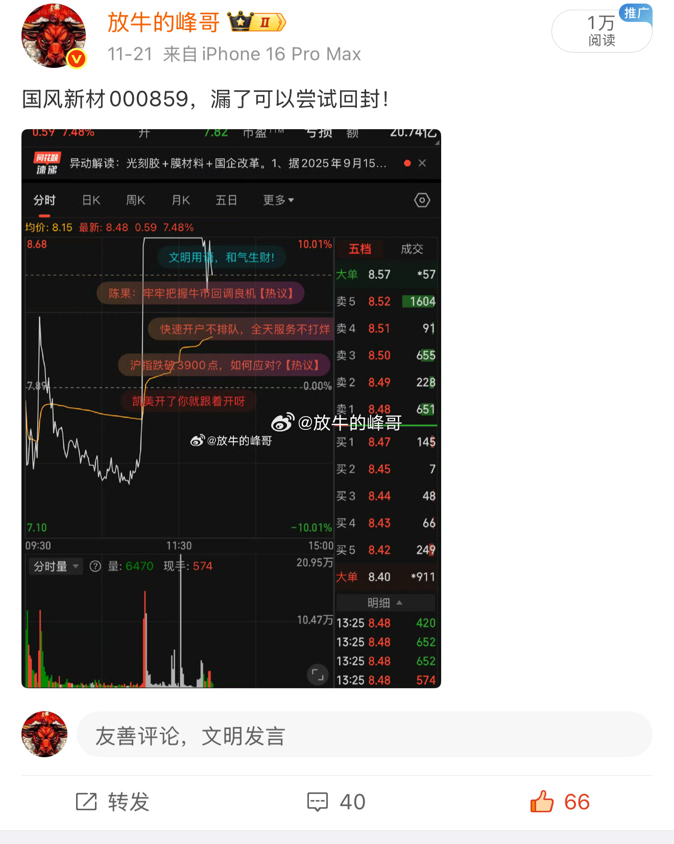 我是第一次看到还有涨停回马枪的操作方法。最近见识了一位朋友的独特操作:专买当