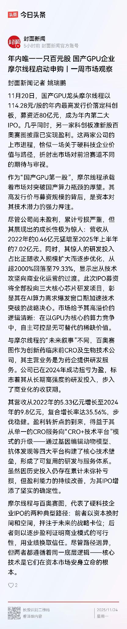 发行价114元 vs 刚刚宣布盈利!一个在赌命,一个在过日子!科创板这两天的新股,写透了硬科技的所有秘密 这两天资本市场有出好戏。国产GPU公司摩尔线程和生物技术公司百奥赛图,几乎同时冲刺科创板。这两家的玩法完全不同,特别有意思。 ①先说摩尔线程——这是在造“火箭” 这家公司发行价定在114.78元,成为今年最贵新股,一口气募了80亿。但它其实还在亏钱,而且亏得不少。 那为什么还有人买单?因为它卡住了AI时代最要害的位置——GPU。这玩意儿就是AI的“发动机”,现在国外卡脖子,国产替代迫在眉睫。 看它财报,营收从2022年的4600万猛增到今年上半年的7个亿,这增长速度像坐火箭。研发投入虽然还在烧钱,但占比已经从早期的2000%降到了79%。 说白了,市场在赌它成为中国的英伟达。现在亏钱没关系,关键是能不能在算力竞赛中抢到座位。这就像十年前投资特斯拉,赌的是未来。 ②再看百奥赛图——这是在修“高速公路” 这家公司做创新药研发服务,刚刚宣布开始赚钱了。从2022年到2024年,营收从5.3亿涨到9.8亿,每一步都走得很稳。 它的商业模式很聪明:一边给药企做研发服务(卖铲子给淘金者),一边靠自己的技术平台收专利费(自己也在淘金)。就像修了条高速公路,既收过路费,自己也跑运输。 ③两种活法,都没毛病 这两家公司给我们上了一课: 摩尔线程走的是“赌明天”路线——技术门槛高,市场空间大,现在亏钱是为了抢占战略制高点。 百奥赛图走的是“赚今天”路线——用现金流养活研发,用盈利能力证明模式可行。 其实硬科技企业本来就不该只有一个模板。有的需要高举高打,有的适合稳扎稳打。关键看它有没有真本事——技术够不够硬,赛道够不够关键,团队靠不靠谱。 ④给投资者的启示 如果你打新摩尔线程,本质上是在赌国运,赌中国能突破芯片封锁。如果你选择百奥赛图,买的是确定性,是看得见的盈利能力。 最让人欣慰的是,现在的资本市场终于能同时包容这两种企业了。这说明我们的创新生态越来越健康,既能养大鱼,也能容得下不同的游法。 这才是中国硬科技该有的样子——有人仰望星空,有人脚踏实地,但都在做实事。