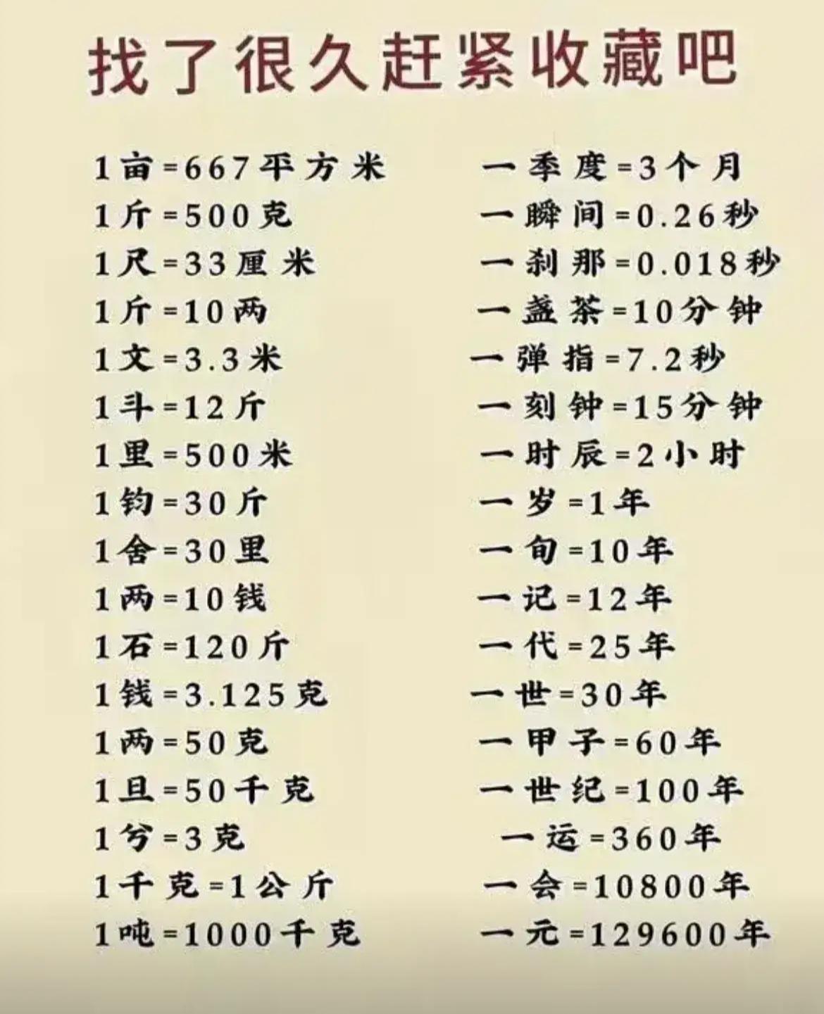 强烈建议大家收藏的这个单位换算表,因为我们很多时候都会用到各种单位,然后有各种换算,包括时间单位啊,长度单位啊,重量弯位啊,我相信很多人都不知道。 常用单位换算表(建议收藏) 一、时间单位换算 • 1世纪 = 100年 • 1年 = 12个月 = 365天(平年)/366天(闰年) • 1个月 = 30天(小月)/31天(大月)/28天(平年2月)/29天(闰年2月) • 1天 = 24小时,1小时 = 60分钟,1分钟 = 60秒 • 1小时 = 3600秒 二、长度单位换算(国际+常用) • 1千米(km)= 1000米(m),1米 = 10分米(dm) • 1分米 = 10厘米(cm),1厘米 = 10毫米(mm) • 1米 = 100厘米 = 1000毫米 • 1公里 = 1千米,1里 = 500米 • 1英寸(in)≈ 2.54厘米,1英尺(ft)= 12英寸 ≈ 0.3048米 三、重量(质量)单位换算 • 1吨(t)= 1000千克(kg),1千克 = 1000克(g) • 1克 = 1000毫克(mg) • 1千克 = 1公斤 = 2斤,1斤 = 500克 • 1斤 = 10两,1两 = 50克