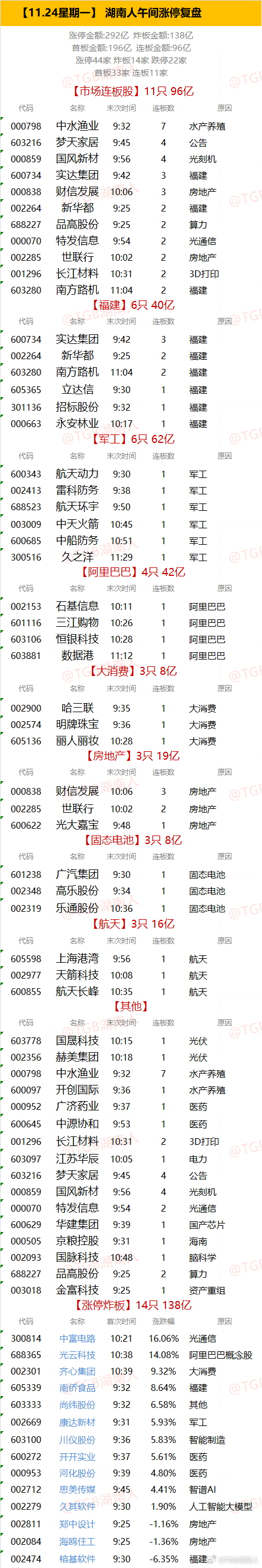 【11.24星期一】 湖南人午间涨停复盘 "涨停金额:292亿 炸板金额:138亿首板金额:196亿 连板金额:96亿涨停44家 炸板14家 跌停22家首板33家 连板11家" 【市场连板股】11只 96亿 代码 名称 末次时间 连板数 原因000798 中水渔业 9:32 7 水产养殖603216 梦天家居 9:45 4 公告000859 国风新材 9:56 4 光刻机600734 实达集团 9:42 3 福建000838 财信发展 10:06 3 房地产002264 新华都 9:25 2 福建688227 品高股份 9:25 2 算力000070 特发信息 9:54 2 光通信002285 世联行 10:02 2 房地产001296 长江材料 10:31 2 3D打印603280 南方路机 11:04 2 福建【福建】6只 40亿 代码 名称 末次时间 连板数 原因600734 实达集团 9:42 3 福建002264 新华都 9:25 2 福建603280 南方路机 11:04 2 福建605365 立达信 9:30 1 福建301136 招标股份 9:32 1 福建000663 永安林业 10:17 1 福建【军工】6只 62亿 代码 名称 末次时间 连板数 原因600343 航天动力 9:30 1 军工002413 雷科防务 9:38 1 军工688523 航天环宇 9:50 1 军工003009 中天火箭 10:45 1 军工600685 中船防务 10:51 1 军工300516 久之洋 11:29 1 军工【阿里巴巴】4只 42亿 代码 名称 末次时间 连板数 原因002153 石基信息 10:11 1 阿里巴巴601116 三江购物 10:26 1 阿里巴巴603106 恒银科技 10:28 1 阿里巴巴603881 数据港 11:12 1 阿里巴巴【大消费】3只 8亿 代码 名称 末次时间 连板数 原因002900 哈三联 9:35 1 大消费002574 明牌珠宝 9:36 1 大消费605136 丽人丽妆 10:28 1 大消费【房地产】3只 19亿 代码 名称 末次时间 连板数 原因000838 财信发展 10:06 3 房地产002285 世联行 10:02 2 房地产600622 光大嘉宝 9:48 1 房地产【固态电池】3只 8亿 代码 名称 末次时间 连板数 原因601238 广汽集团 9:30 1 固态电池002348 高乐股份 9:34 1 固态电池002319 乐通股份 10:36 1 固态电池【航天】3只 16亿 代码 名称 末次时间 连板数 原因605598 上海港湾 9:56 1 航天002977 天箭科技 10:08 1 航天600855 航天长峰 10:35 1 航天【其他】 代码 名称 末次时间 连板数 原因603778 国晟科技 10:15 1 光伏002356 赫美集团 10:18 1 光伏000798 中水渔业 9:32 7 水产养殖600097 开创国际 9:36 1 水产养殖000952 广济药业 9:37 1 医药600645 中源协和 9:53 1 医药001296 长江材料 10:31 2 3D打印603097 江苏华辰 10:05 1 电力603216 梦天家居 9:45 4 公告000859 国风新材 9:56 4 光刻机000070 特发信息 9:54 2 光通信600629 华建集团 9:39 1 国产芯片000505 京粮控股 9:31 1 海南002093 国脉科技 10:48 1 脑科学688227 品高股份 9:25 2 算力003018 金富科技 9:25 1 资产重组【涨停炸板】14只 138亿 代码 名称 首次时间 涨跌幅 原因300814 中富电路 10:21 16.06% 光通信688365 光云科技 10:38 14.08% 阿里巴巴概念股002301 齐心集团 10:39 9.32% 大消费605339 南侨食品 9:32 8.64% 福建603333 尚纬股份 9:32 6.58% 其他002669 康达新材 9:31 5.93% 军工603100 川仪股份 9:36 5.83% 智能制造600272 开开实业 9:37 5.61% 医药000953 河化股份 9:39 4.80% 医药002712 思美传媒 9:45 4.41% 智谱AI002279 久其软件 9:30 1.90% 人工智能大模型002811 郑中设计 9:25 -1.16% 房地产002084 海鸥住工 9:25 -1.36% 房地产002474 榕基软件 9:30 -6.35% 福建