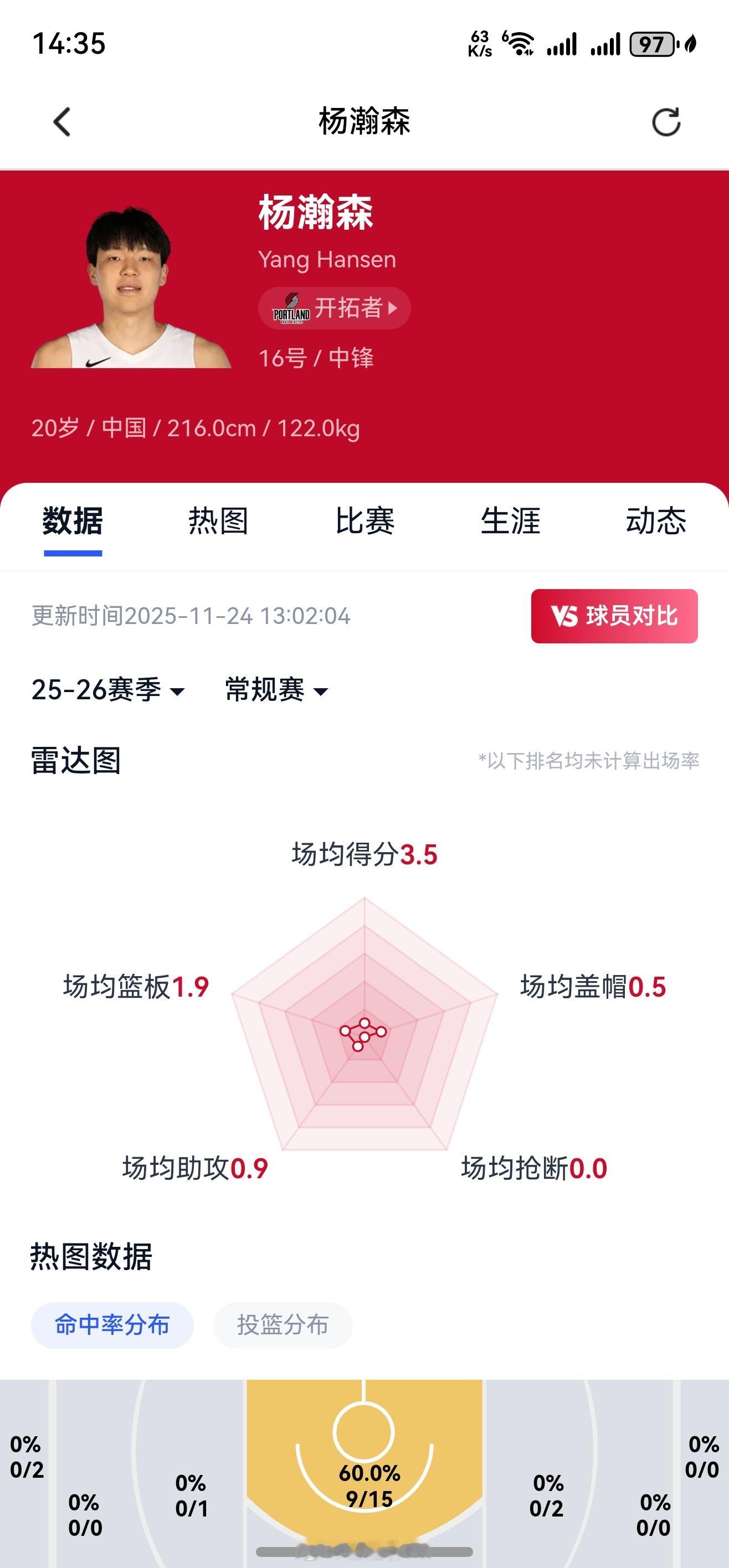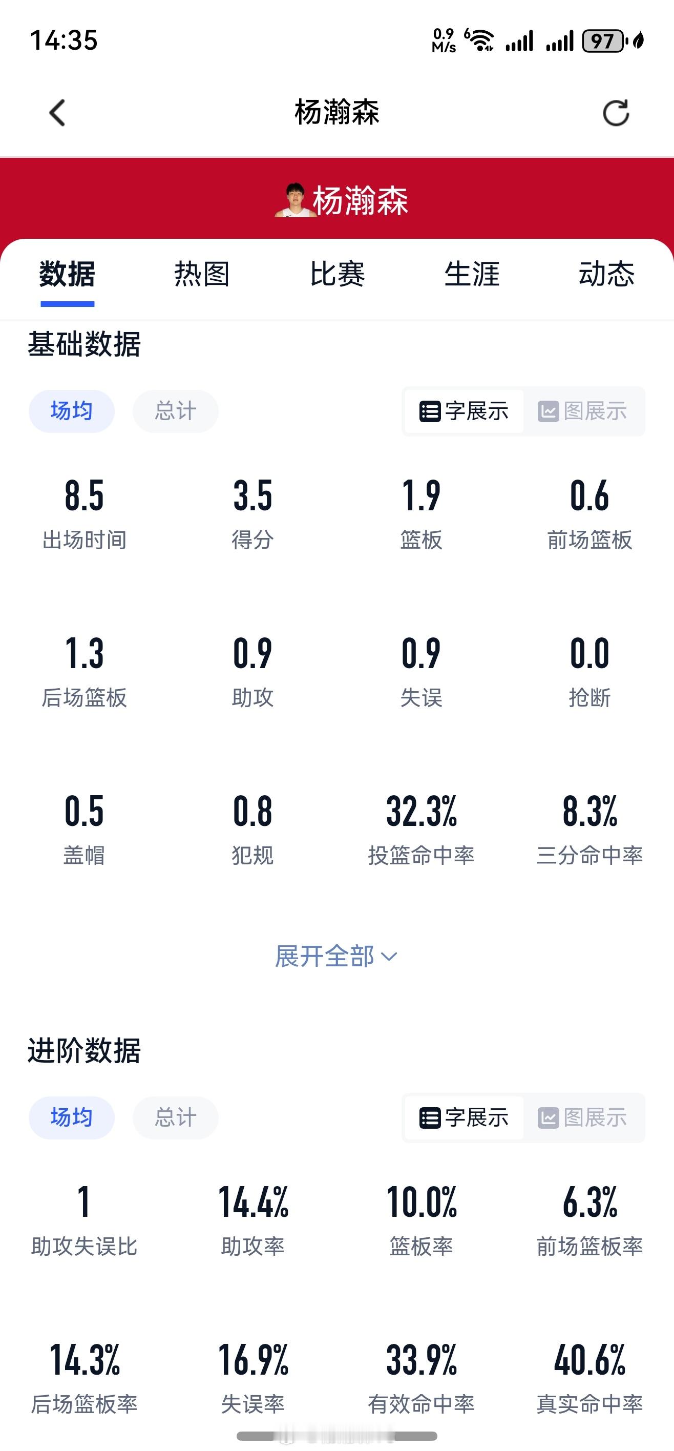截止目前杨瀚森在场均8.5分钟上场时间里能拿到3.5分1.9篮板0.9助攻0.5盖帽。总的来说命中率太低,失误控制不好,当然这些归根结底就是他体能有问题的表现。所以还得上场打着练,相信未来会更好。