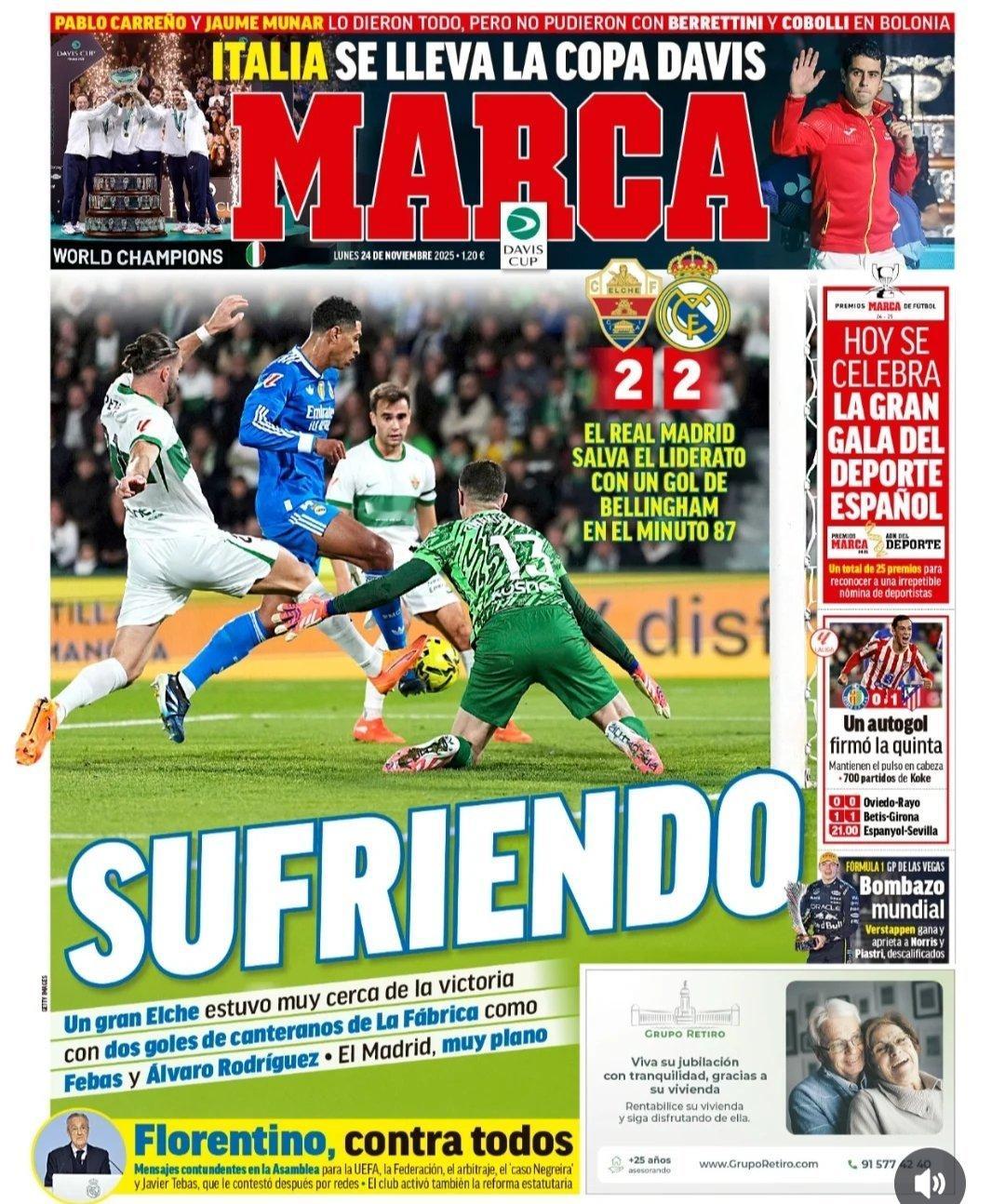 《马卡》磨难皇马靠87分钟贝林厄姆的进球挽回榜首位置表现出色的埃尔切靠着皇马青训小将费巴斯和阿尔瓦罗·罗德里格斯的进球非常接近获胜