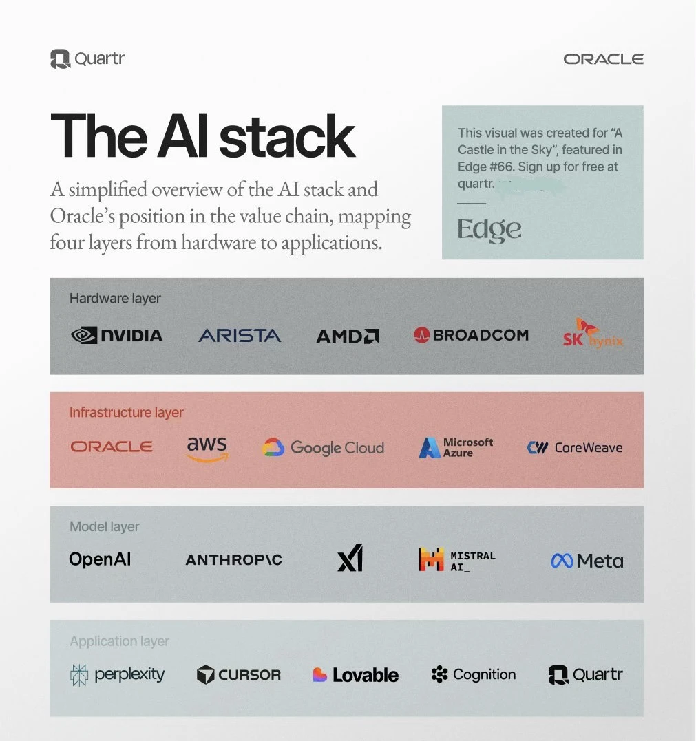 👉 Oracle 在此层承担算力集群、低成本云服务器、AI 模型训练底座,是核心参与者。