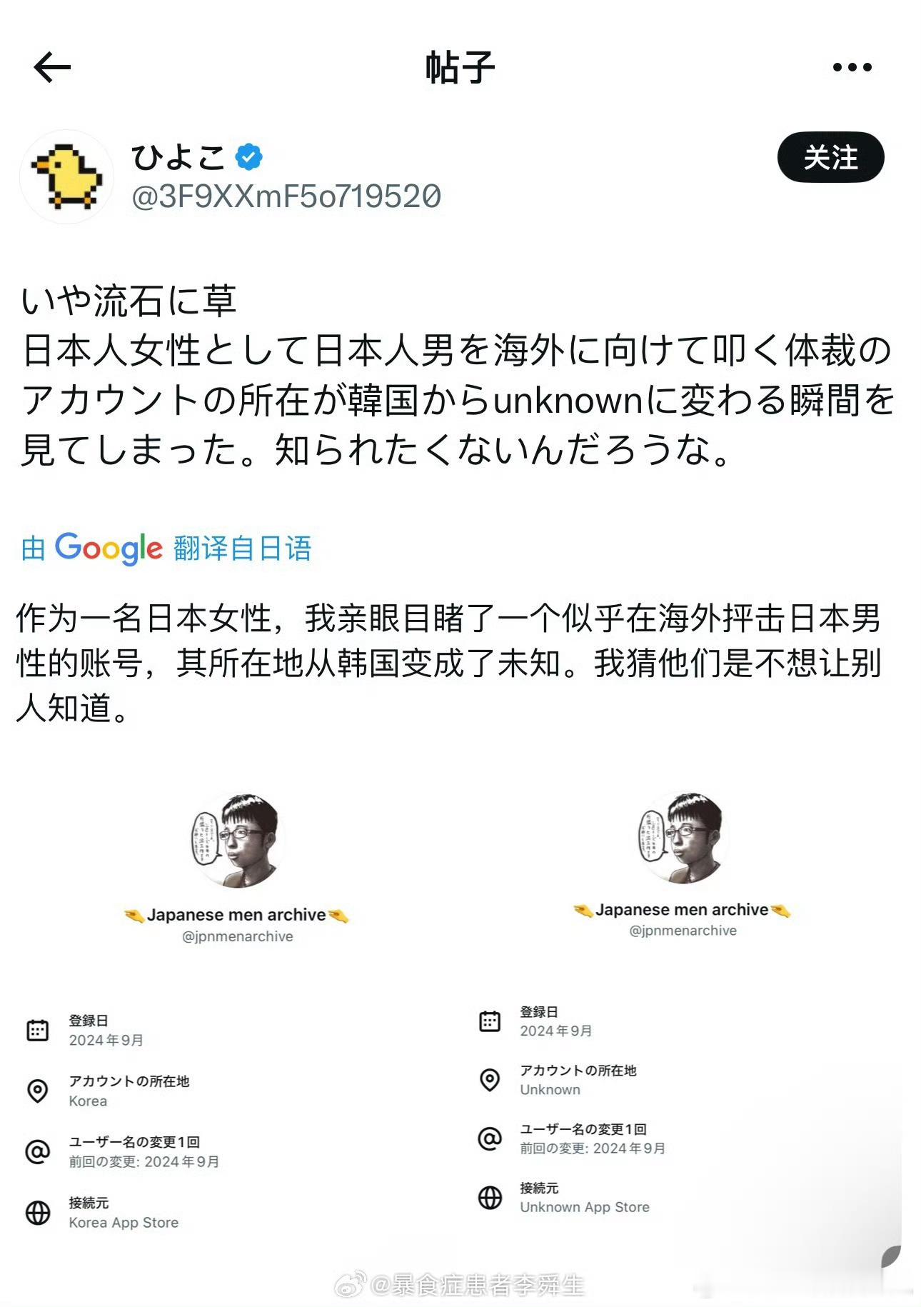 日本女权账号被发现是韩国人在运营的,然后改IP为unknown,随后删号