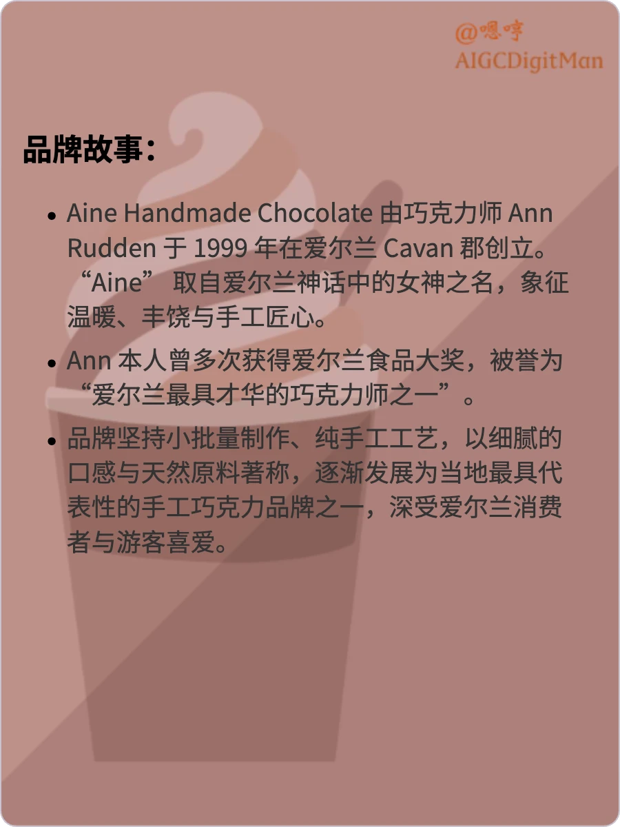 “Aine” 取自爱尔兰神话中的女神之名,象征温暖、丰饶与手工匠心。Ann 本人曾多次获得爱尔兰食品大奖,被誉为“爱尔兰最具才华的巧克力师之一”。
