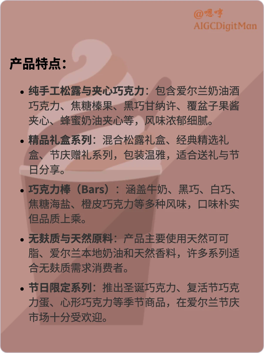无麸质与天然原料:产品主要使用天然可可脂、爱尔兰本地奶油和天然香料,许多系列适合无麸质需求消费者。