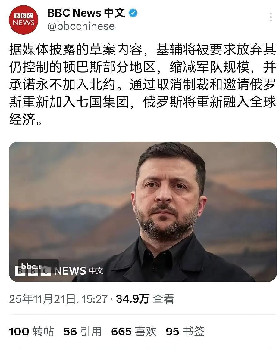 泽连斯基已经准备投降了,美国准备了让丧权辱国的28条让泽连斯基签字,不签字就立马断武器援助和情报分享。 就这样,泽连斯基还只能说感谢美国。 可悲吗? 真可悲。 不过3年前的泽连斯基可不是这样,他到哪里都是前呼后拥众星捧月意气风发,而现在呢? 图四的落寞完美地展现出他一个被抛弃的垃圾的处境。 而在这个时候蓬蓬还出来补刀,说乌克兰的橙色革命反抗俄罗斯拒绝了出卖国家。 现在土地被俄罗斯占领了,矿产全部都卖给美国了,嗯,这没有出卖国家。这很美国。 顺便说一句,欧洲也对这28条没啥意见。当然,在美国面前,他们能有什么意见?在税宗面前不是跟小学生一样吗? 乌克兰安息吧! 谢谢你作为大体老师为我们提供了不作死就不会死、舔狗舔狗舔到最后一无所有以及再苦再累都必须独立自主的血的教训。 R.I.P. 点右上角关注我,我们一起去看这个魔幻的世界