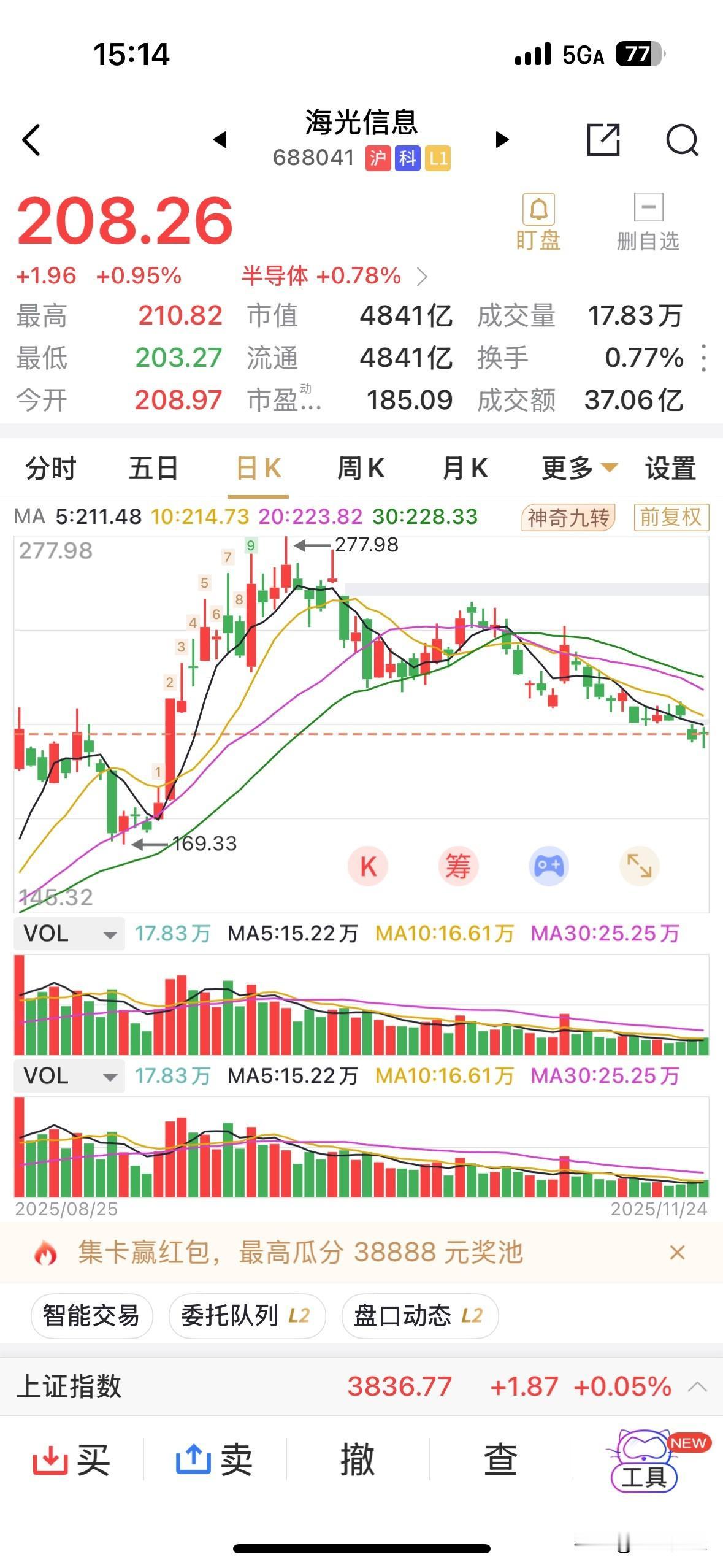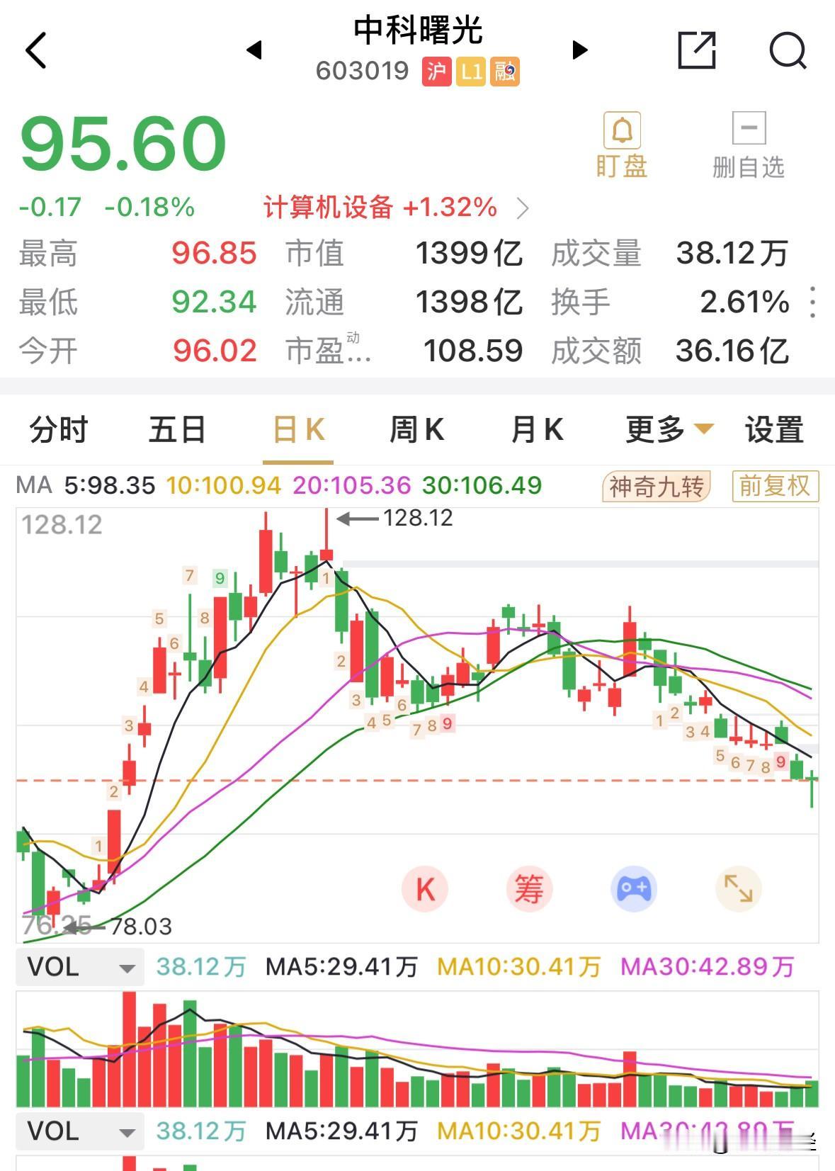 中科曙光跌破百元大关后,迟迟无法收回,今日收跌,收95.6元,盘中创下回调新低92.34元,距离高点回调已超20%,而相反的海光信息则收涨近1%,收208元,难道吸并因遥遥无期而暂停了吗?中科曙光换0.5505股的海光信息,己相当于118元,目前对于中科曙光而言,已经不止需要涨20%。 之前以117元清仓的中科曙光似乎又有了吸引个人眼球的理由! 个人观点,勿作操作建议!